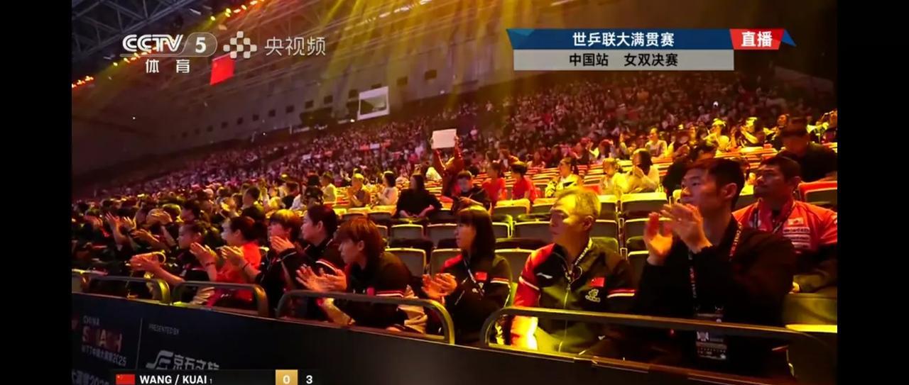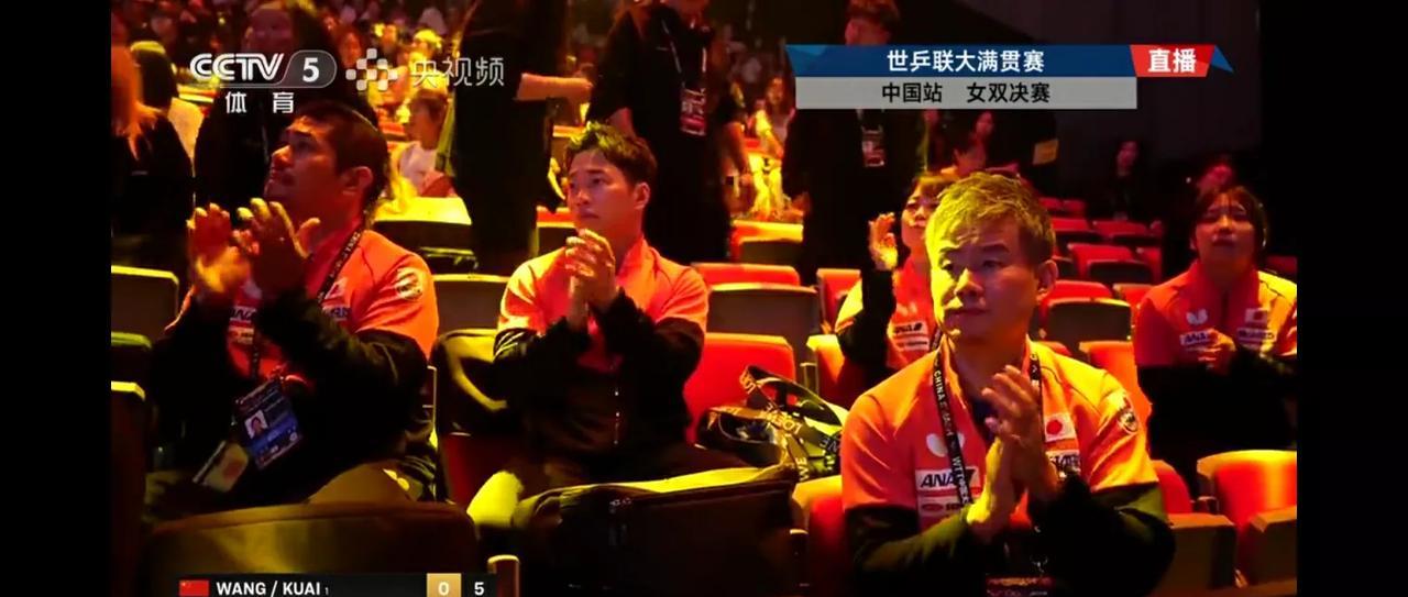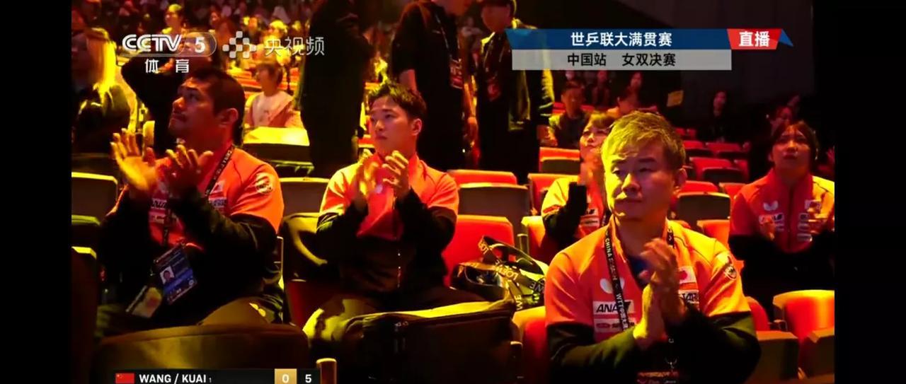 北满女双决赛,王曼昱蒯曼对跨国组合早田希娜朱芊曦,目前大比分1-1,镜头先是给到了国乒观赛团,王励勤主席也来关注决赛了,镜头又给到了日方观赛团,钟泽瑞率日方也来观赛,估计中国队夺冠概率百分之百!