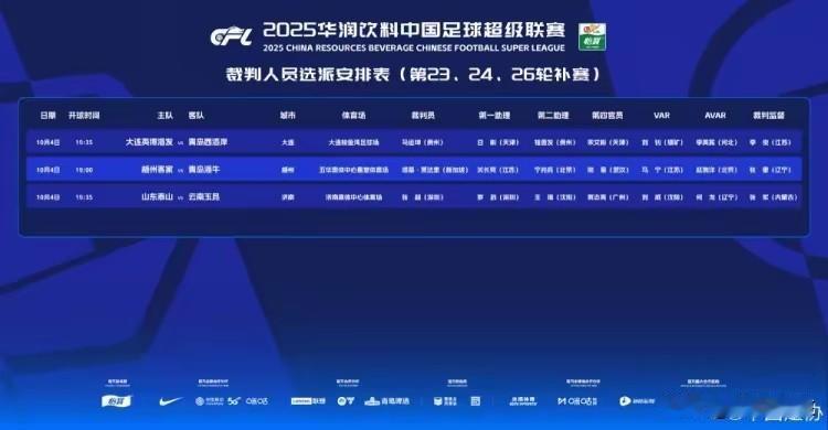 中超第26轮山东泰山主场对阵云南玉昆的补赛裁判已经公布,主裁判是张超,Var裁判