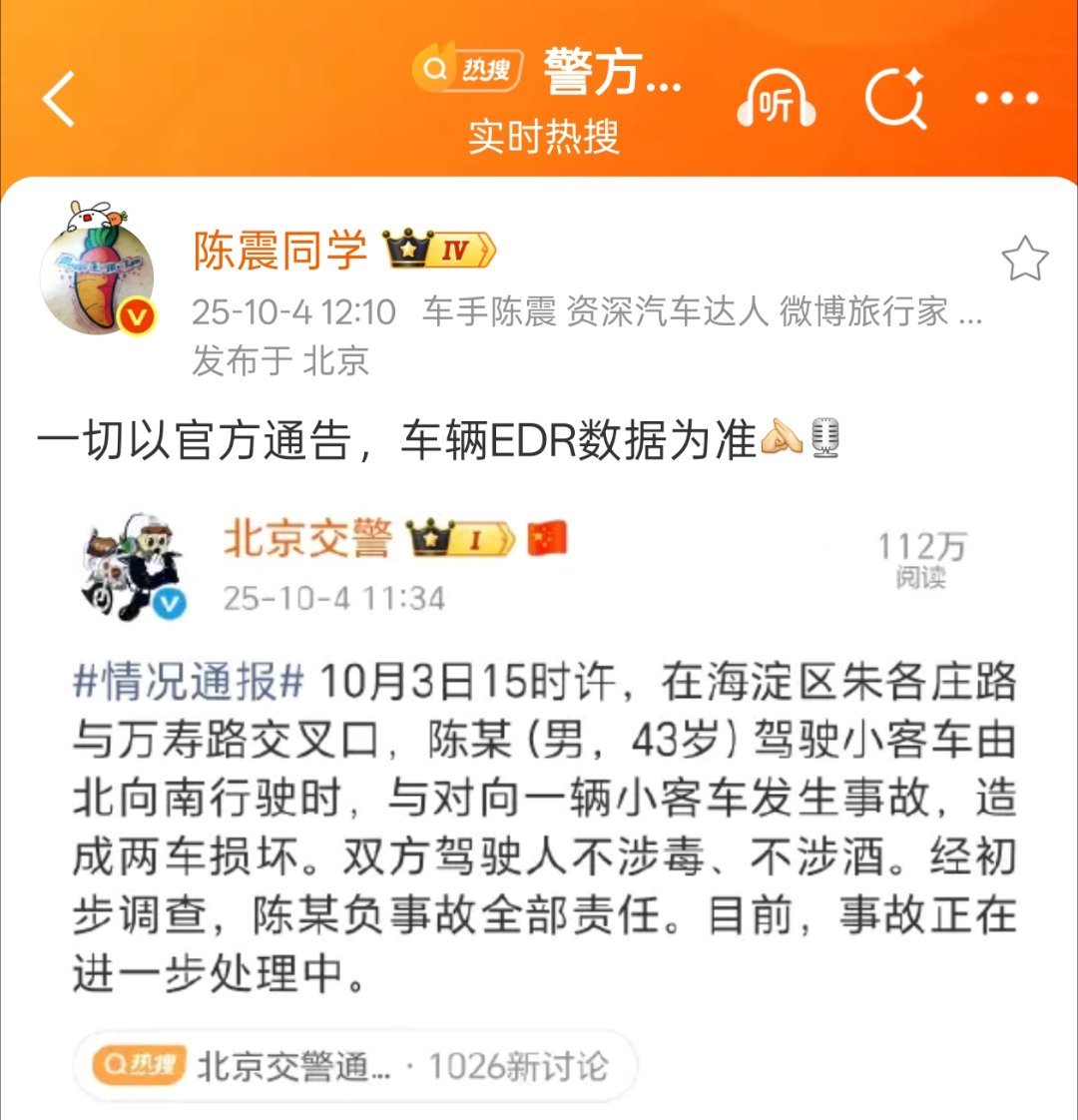 陈震妻子回应陈震称以车辆EDR数据通告为准可能大家都想知道实情。也想吃吃瓜吧。[