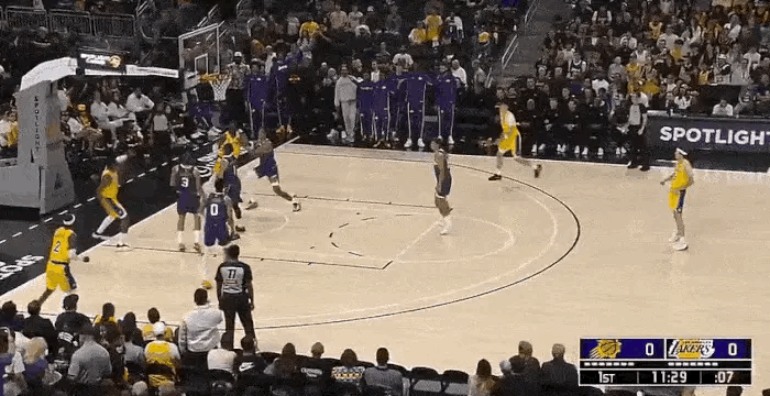 一开场,艾顿就在太阳三人包夹下硬生生抢下进攻篮板,随即转身将球甩到弧顶——里夫斯接球直接强投三分命中,为湖人拿下首分!