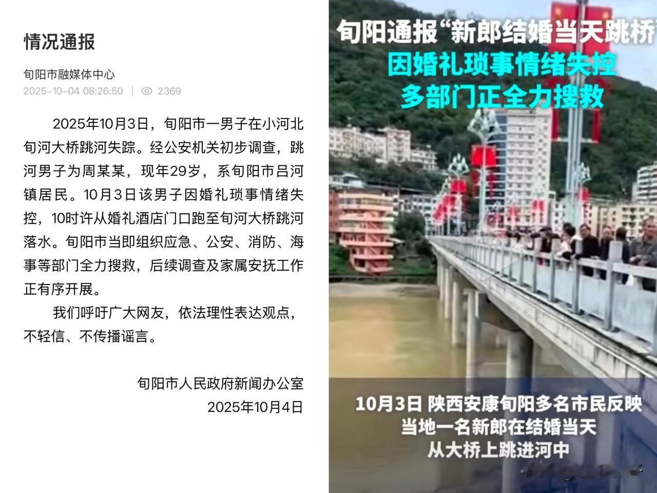 今日,一则令人心碎的消息在网络传开——2025年10月3日,29岁的周某某在婚礼当天从旬河大桥一跃而下,至今生死未卜。本是人生最幸福的时刻,为何会以这样的悲剧收场? 喜事瞬间变悲剧,据官方通报,当天周某某因“婚礼琐事情绪失控”,未披露具体纠纷细节。呼吁公众“不传谣、不信谣”,等待调查结果。 有当地网友说是因为彩礼问题!!大喜的日子,谁能想到发生这种事,昨天跳的今天还没有找到人,有网友说开始是准备了20万彩礼,现场又临时要几万下车钱,新郎家里因无力支付引发争执,情绪崩溃跳河。新郎父母为农民,20万彩礼系贷款筹措,婚礼总花费超50万元。但上述说法未获官方证实。 本是大喜之日,却因一时冲动酿悲剧,令人扼腕,也呼吁遇事冷静沟通。太冲动了男生太傻了,直接取消婚礼婚车调头回家就好。面对满堂宾客、期待已久的家人,可能这个年轻人可能觉得已无路可退,在重大人生节点上,年轻人承受着来自经济、家庭、社会的多重压力,却缺乏有效的情绪疏导渠道。 任何纠纷都不值得以生命为代价。搜救工作仍在继续,让我们为周某某祈祷。