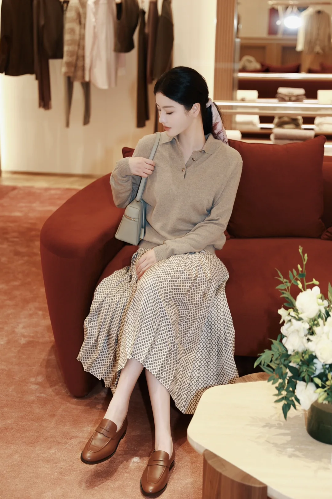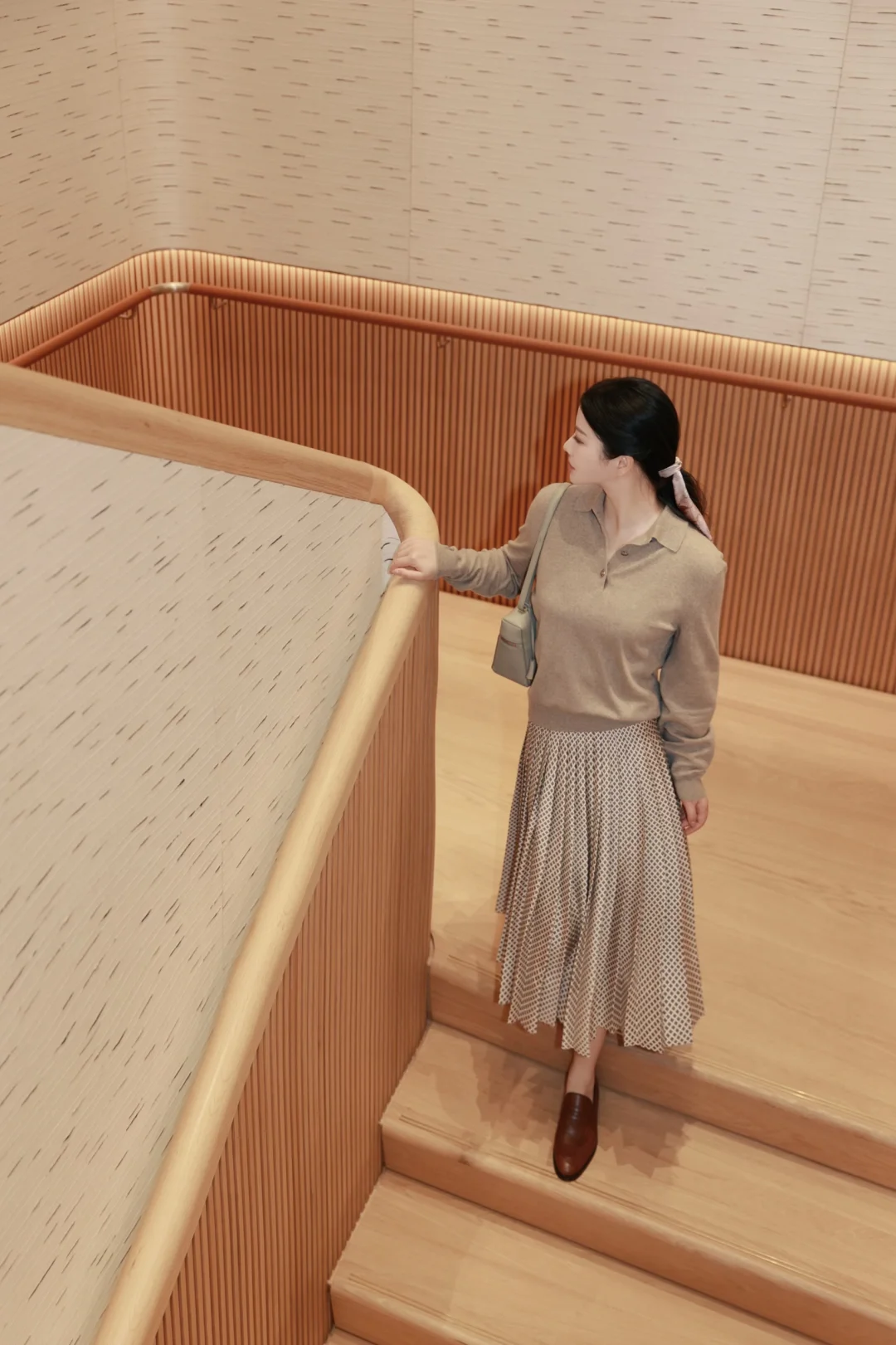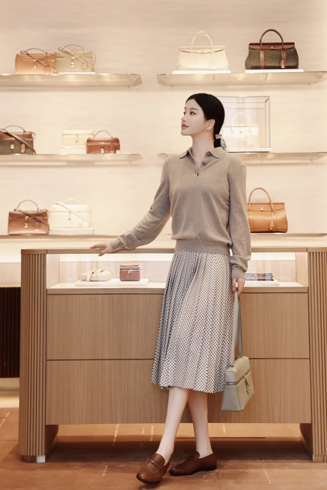 时常在武汉SKP的K大道散步,前几日逛街时观察到,Loro Piana以一座独栋的酒红色🍷建筑,在此悄然落成其于国内唯一的独栋精品店。 它不像寻常的橱窗,更像一座私密的现代宅邸。信步而入,空间的流动感将人温柔包裹,直至二楼的VIC贵宾室,才将喧嚣彻底隔绝,成全了一方只服务于极致品位的静谧天地。 在这样的场域里,穿着便是一场无声的对话。我为自己选择的,是一身内敛的「暖语」。 ☁️一件polo领羊绒衫,是Loro Piana对“软黄金”最精妙的诠释。Baby Cashmere 独家羊绒是触及肌肤时才感知的细腻云团,将奶茶色的温润烘托得恰到好处,仿佛是自身散发着的柔和光晕。 👗一条百褶裙,是关于流动的叙事。每一道裙褶都承载着桑蚕丝独有的垂坠与光泽,步履移动间,只荡开如水波般柔和的涟漪,与羊绒的静态温暖,构成一动一静的诗篇。 🥿一双棕色乐福鞋,是整身搭配沉稳的句读。其色泽如经年摩挲的旧书封皮,与奶茶色羊绒形成了有层次的渐变,将一切轻盈的质感,最终安然地锚定于大地。 这一身,从材质到色系,皆与这座独栋精品店的语境浑然天成——它不仅是购物的场所,更是一种关于美学的沉浸式体验,而我的穿着,正是为这次体验写下的前言。