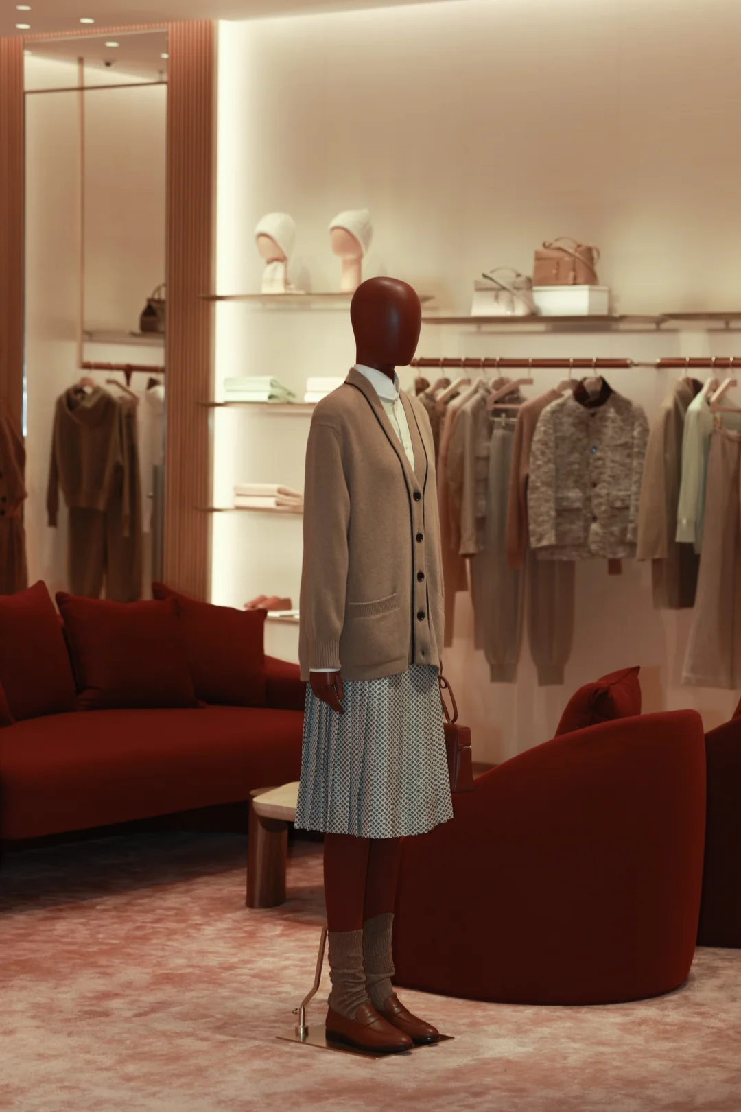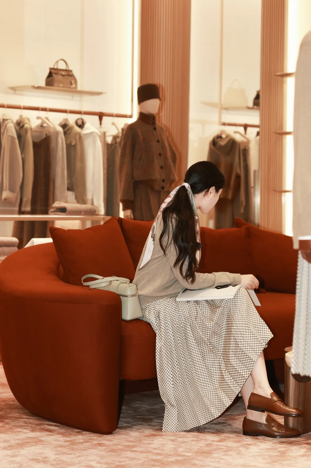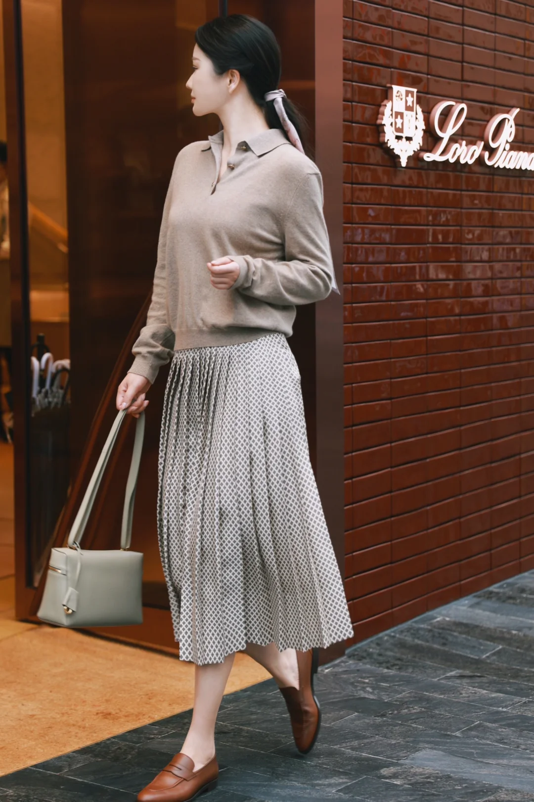 时常在武汉SKP的K大道散步,前几日逛街时观察到,Loro Piana以一座独栋的酒红色🍷建筑,在此悄然落成其于国内唯一的独栋精品店。 它不像寻常的橱窗,更像一座私密的现代宅邸。信步而入,空间的流动感将人温柔包裹,直至二楼的VIC贵宾室,才将喧嚣彻底隔绝,成全了一方只服务于极致品位的静谧天地。 在这样的场域里,穿着便是一场无声的对话。我为自己选择的,是一身内敛的「暖语」。 ☁️一件polo领羊绒衫,是Loro Piana对“软黄金”最精妙的诠释。Baby Cashmere 独家羊绒是触及肌肤时才感知的细腻云团,将奶茶色的温润烘托得恰到好处,仿佛是自身散发着的柔和光晕。 👗一条百褶裙,是关于流动的叙事。每一道裙褶都承载着桑蚕丝独有的垂坠与光泽,步履移动间,只荡开如水波般柔和的涟漪,与羊绒的静态温暖,构成一动一静的诗篇。 🥿一双棕色乐福鞋,是整身搭配沉稳的句读。其色泽如经年摩挲的旧书封皮,与奶茶色羊绒形成了有层次的渐变,将一切轻盈的质感,最终安然地锚定于大地。 这一身,从材质到色系,皆与这座独栋精品店的语境浑然天成——它不仅是购物的场所,更是一种关于美学的沉浸式体验,而我的穿着,正是为这次体验写下的前言。