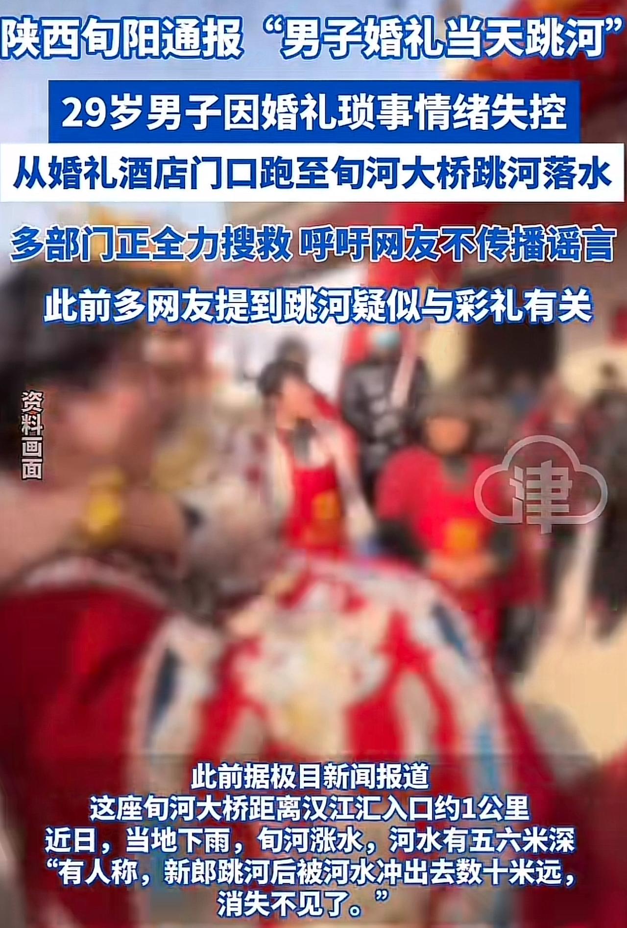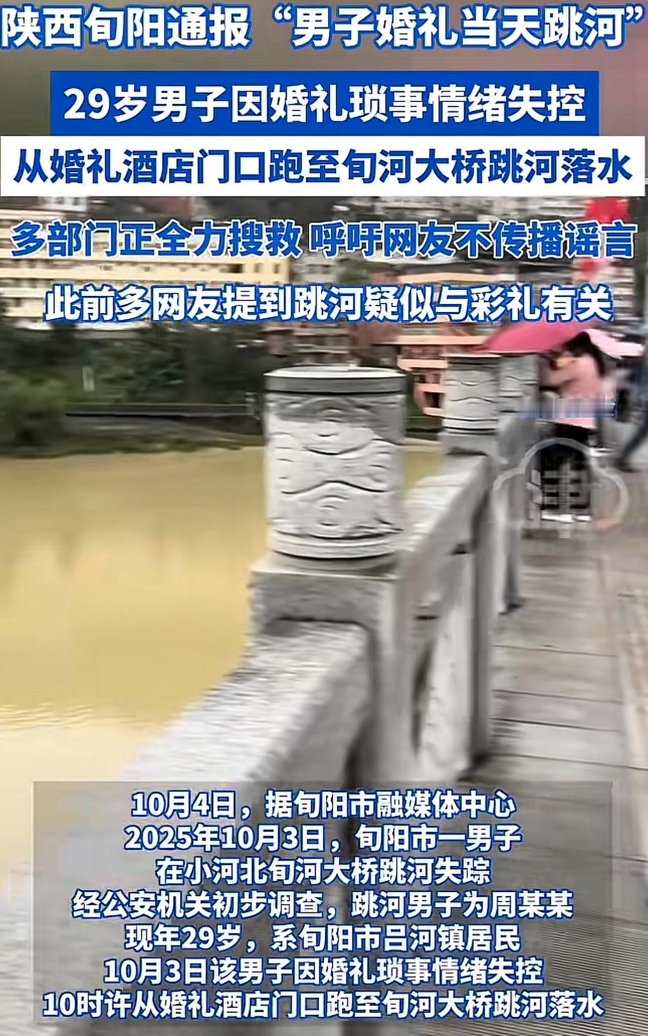 婚礼当天新郎跳河,30小时还没找到:比河水还急的是瞎传,比人没影更揪心的是这事儿 婚礼还差一小时开场,29岁的小周穿着没换完的礼服,从酒店门口一头扎进雨里,往旬河大桥跑,跟着就跳下去了。谁也猜不着他跑那几百米时脑子里翻涌的是啥,就剩一屋子等着喝喜酒的宾客僵在那儿——10月3号上午这婚,压根没开席就变了寻人场面。 连着下了好几天雨,旬河早成了浑黄的大水沟,五米多深的水裹着树枝杂草往前冲,潜水员根本下不去,声呐扫来扫去也没个准信,到4号下午,搜救的人还在河边守着。他爸赶来的时候腿都打晃,嘴里就重复“好些事儿堆一块儿了”,话没说完眼眶就红透了。 网上早吵翻了天,有人说他是被20万彩礼逼的,新娘临时要2万下车费才走了绝路;还有人编他妈妈也跟着跳河,被救上来还哭着喊儿子。结果官方很快就说了实话:彩礼那事儿是瞎编的,他妈妈跳河更是没影的事,就是“办婚礼时一堆破事攒着,情绪没绷住”。 我刷着那些说得跟真事儿似的瞎话,心里堵得慌。就算办婚礼真遇上糟心的,就算备婚累得喘不过气,大不了不结了、吵一架、找亲戚评评理,哪条路不比跳河强?每年中央文件都提要管管高额彩礼,可有些地方的老规矩还是往人脖子上套,更别说没人提醒过,婚礼前那股子压得人喘不上气的劲儿,其实该找个人好好念叨念叨。 现在就盼着搜救队能有好消息。说到底,纠结那些没影的传言没啥用,更该琢磨的是:咋别让下一个准备结婚的人,觉得跳河是唯一的退路。29岁男子婚礼当天跳河 彩礼