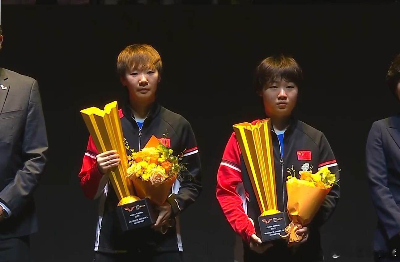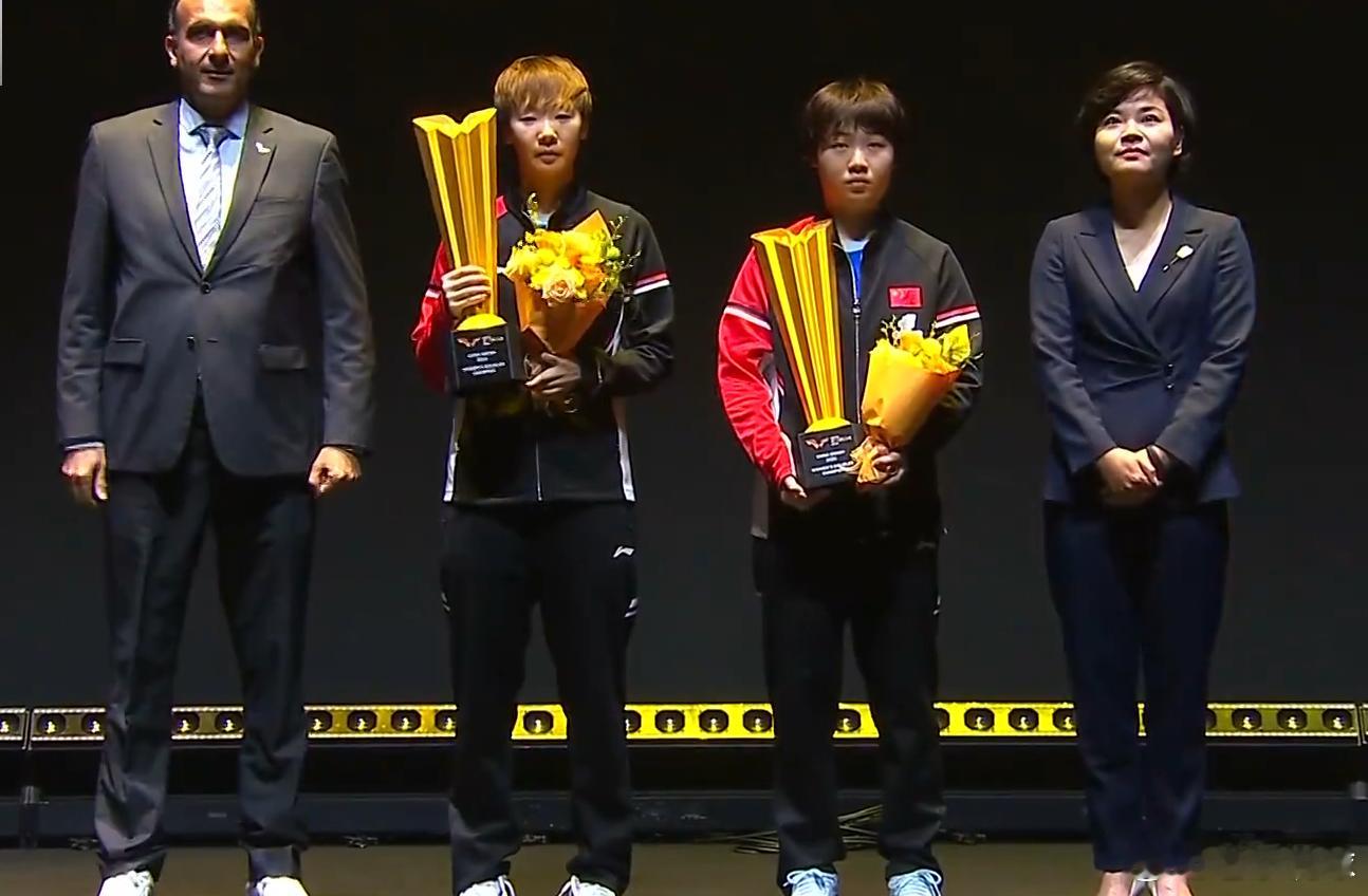 恭喜女双冠军王曼昱蒯曼这奖杯就不能设计的轻一点吗