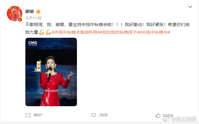 这也是谢娜作为主持人首次参加央视中秋晚会,10月4日,谢娜发文:不敢相信,我,谢娜,要主持央视中秋晚会啦!我好激动!我好紧张!希望你们给我力量[加油][加油]