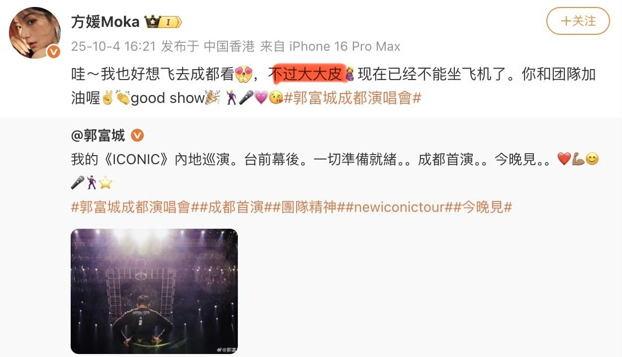 前段时间网传郭富城老婆方媛生了三胎,但今天方媛说“现在已经不能坐飞机”。这是还没生啊?[吃瓜][吃瓜][吃瓜]方媛疑似否认三胎已出生
