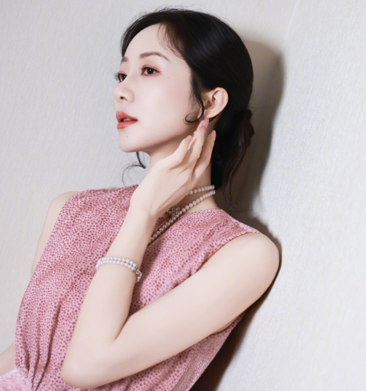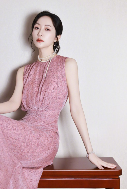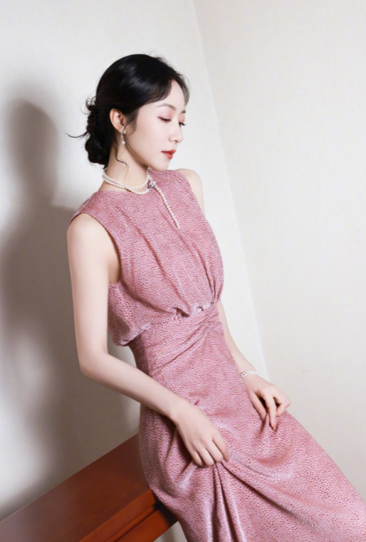 身着一袭粉色无袖长裙,搭配白色尖头高跟鞋,脖颈间佩戴着珍珠项链,女人味十足,优雅灵动!