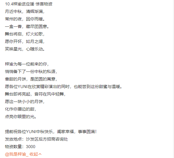 梓渝给粉丝准备了月饼,梓渝提前祝各位中秋快乐,谁来懂一下这个小梓渝的真诚感啊,那就期待住待会和梓渝的舞台的见面啦~
