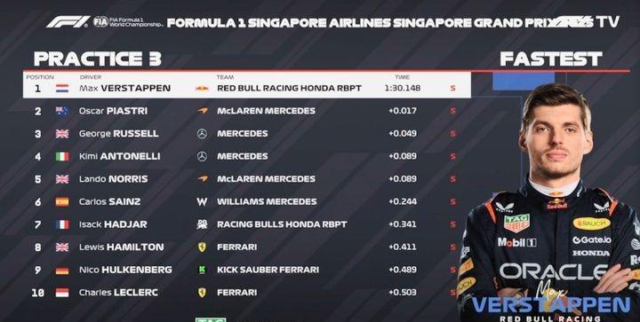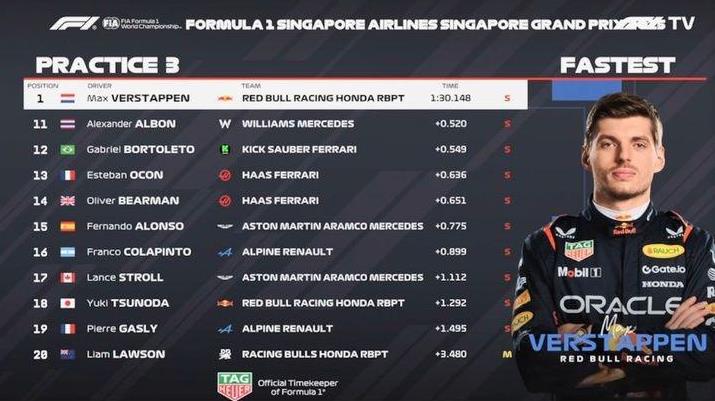 新加坡大奖赛三练结束,维斯塔潘1:30.148拿下第一,皮亚斯特里仅落后0.01