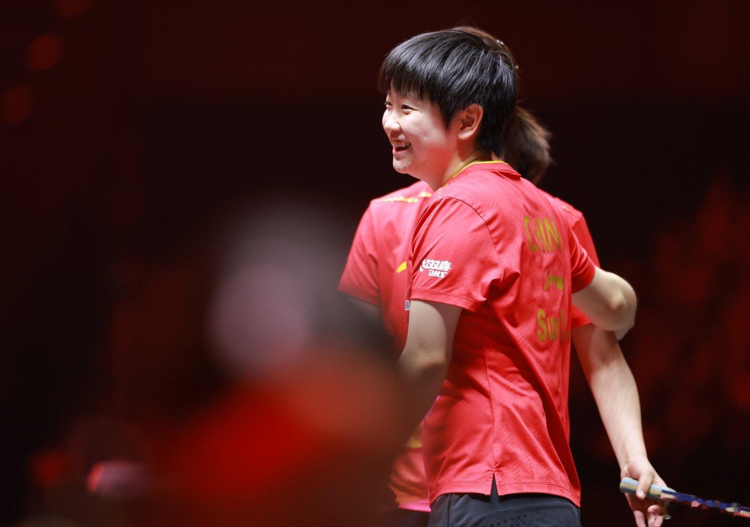 孙颖莎憋笑打完最后一球 被连续擦边搞笑了[允悲](白宇 摄)