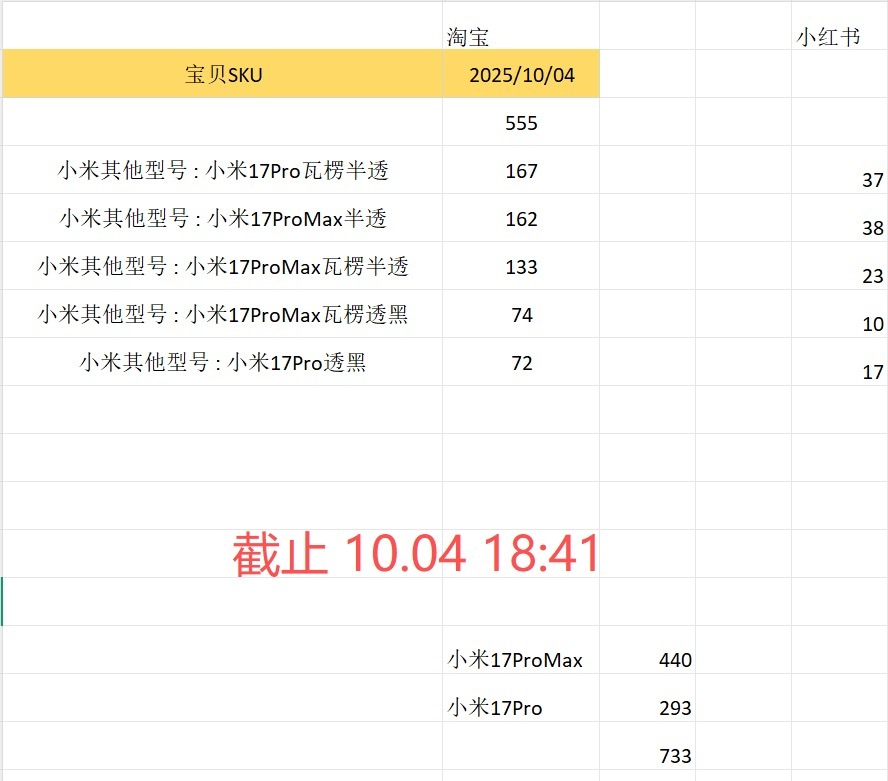 再发一个今天截止到现在的小米17Pro/17ProMax 壳子销售情况,今天0点到18:40分,总共销售了733个,Max 440,小 Pro 293。