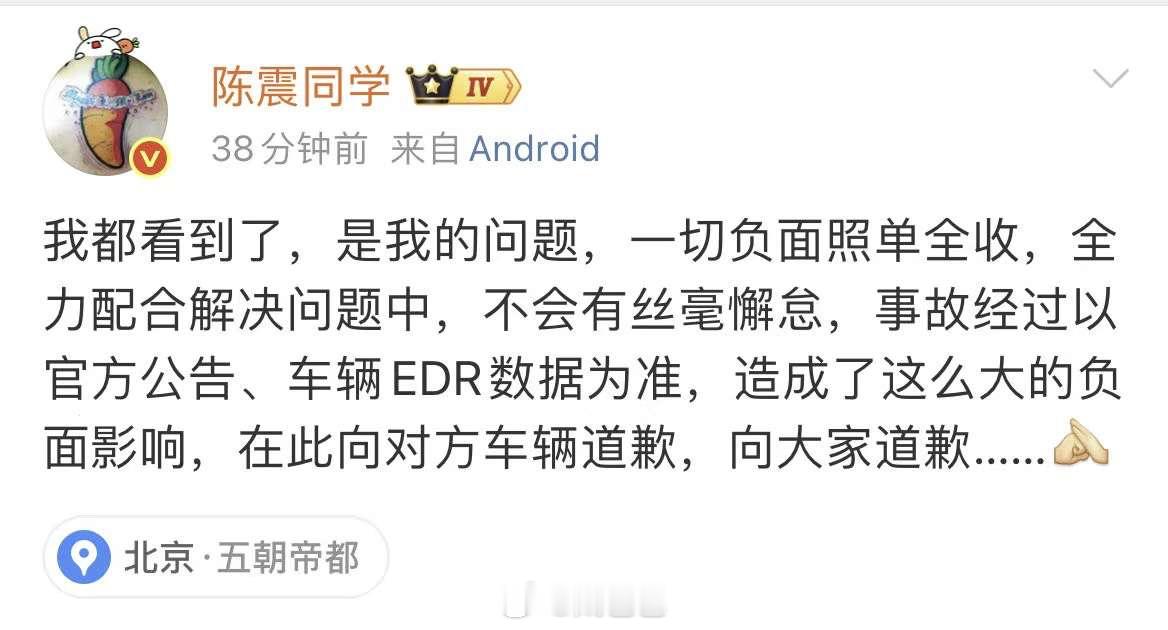 比较明确的信息不涉毒 不涉酒,全责陈震劳斯莱斯发生车祸