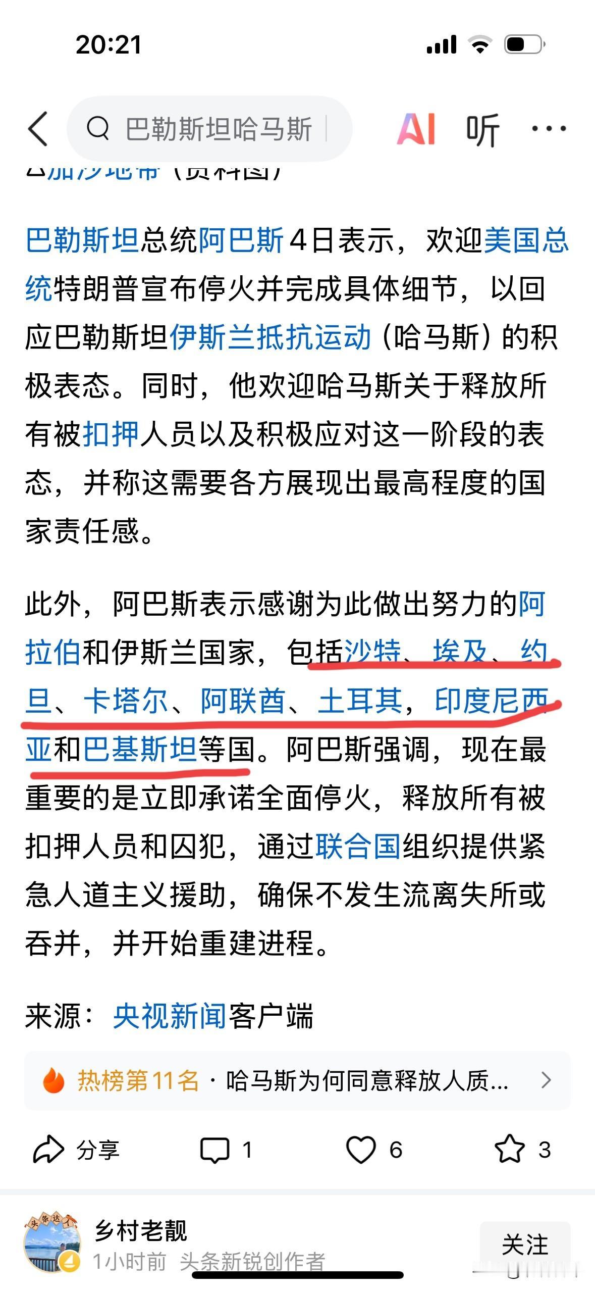 针对哈马斯和以色列响应特朗普20条、初步达成加沙安全协议,阿巴斯感谢的国家有:沙特、埃及、约旦、卡塔尔、阿联酋、土耳其,印度尼西亚和巴基斯坦。 阿巴斯开列的名单就是他所认为的贡献度排名。俄罗斯等国家进入不了排行榜,虽然他们口干舌燥,但不能过高估计自己在巴以问题上的影响力。