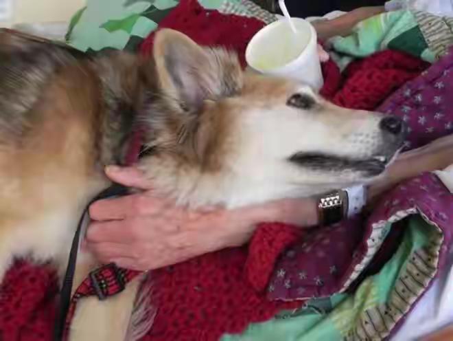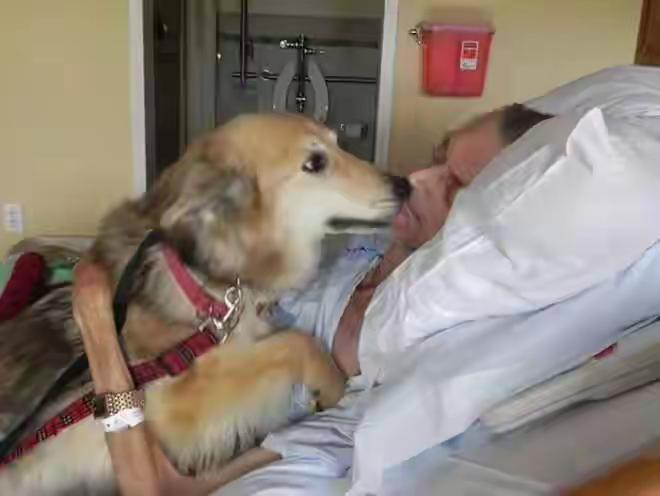 老人临死前想见自己养的狗狗,当子女把狗狗带到医院病房时,狗狗舔着老人的脸,眼神充