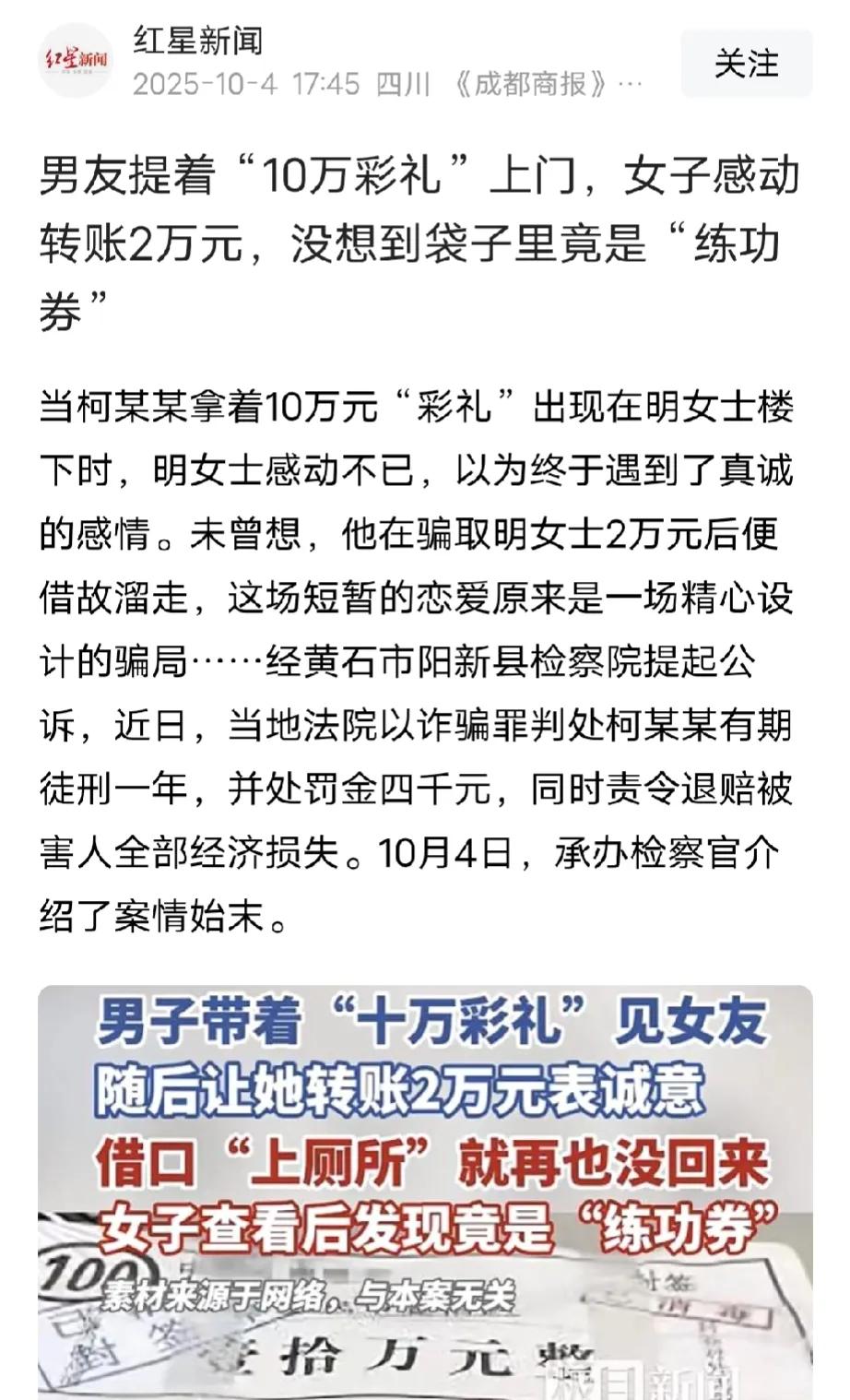 湖北黄石,女子在网上认识一男子,两人交往14天后,男子提着10万彩礼来到女子家,说要娶她为妻,并表示,如果自己能看到女子的诚意,下午会再给她补10万,女子感动不已,当即转了2万元给男子,没想到,男子收到钱后,趁女子洗头时偷偷跑路,并拉黑女子,女子感到不妙,洗完头回家一看,才发现那10万块全部是练功卷,没一张真钞。女子气坏了。报警处理,结果悲剧了。 2024年12月10日,明女士在玩手机的时候无意中进入一App交友网站,抱着试试的心态,她点击了匹配好友。 几分钟后,平台帮她匹配了一名男士,聊了几分钟,两人发现,彼此很投缘,为方便聊天,他们相互加了微信。 在微信上,两个人就像打开了话匣子,越聊越有话题,男士告诉明女士他姓柯,没有对象, 明女士说,她也一直没找到合适的对象。 聊天中,柯先生多次跟明女士表示,他是以“结婚为目的”寻找伴侣的。 明女士觉得柯先生态度很真诚,说话得体又不失风趣,是自己喜欢的类型。 聊了几个小时候后,他们不仅从文字到语音聊天、还打了视频通话,那天两人就确定了恋爱关系。 明女士总感觉,柯先生是老天安排给她的伴侣,是她的缘分。 聊了几天后,两人就奔现了,柯先生长相帅气,身材也不错,是明女士喜欢的类型。 柯先生也说,他喜欢明女士这样温柔、端庄的女生,是他的理想对象。 之后,两人像很多想情侣一样一起看电影、逛商场、周末相约郊外游玩,也会在深夜互道晚安。 2024年12月24日那天,柯先生突然提着一袋东西,来到明女士家,他深情款款地看着明女士说,袋子里是10万元,是我娶你的彩礼钱。 明女士听完感动得落泪,她扑进柯先生怀里,感觉自己是世上最幸福的女人。 柯先生抱紧明女士,两人一起憧憬着美好未来,一起计划着见家长、讨论他们的结婚事宜。 聊了许久,柯先生提起那袋沉甸甸的彩礼,调皮地说,这是我对你满满的诚意,你对我的诚意在哪呢? 柯先生跟明女士承诺,只要自己能看到她的诚意,下午会再给她补10万元过来。 明女士感动不已,当场拿出手机给柯先生转了2万元。 柯先生说,这两万块钱他先收着,下午会还给明女士,并一起带来10万元。 明女士有点疑虑,想去看看那袋彩礼钱,她跟柯先生提出,要拿那10万块钱去银行存。 被柯先生阻止了,他说,等下午他把那10万元拿来,再一起去存。 明女士想想觉得有道理,两人计划下午去柯先生家见他父母。 出门前,柯先生提出让明女士去发廊洗个头,把自己打扮得精神些,给未来公婆留下好的印象。 明女士觉得柯先生想得很周到,所以两人手拉着手去发廊。 明女士洗头的时候,柯先生说他要上厕所,谁料他偷偷溜了。 明女士洗好头,左等右等不见柯先生,再打电话,发现已经被拉黑了。 明女士心里一慌,觉得不妙,她赶紧往家跑,当她打开那一袋彩礼,才发现里面装的根本不是真钞而是一袋练功卷。 明女士发现被骗后,立马报警。 不久后,柯先生被抓,面对民警,他只是轻描淡写地说,我缺钱用了,就想搞点钱。 之后,柯先生被检察院以涉嫌诈骗罪起诉到法院,最终,法院判决柯某有期徒刑1年、罚款4000元,另外他得把骗明女士钱还清。 那么,从法律角度如何看待这件事呢? 《刑法》第266条规定,诈骗公私财物,数额较大的,处三年以下有期徒刑、拘役或者管制,并处或者单处罚金。 数额巨大或者有其他严重情节的,处三年以上十年以下有期徒刑,并处罚金;数额特别巨大或者有其他特别严重情节的,处十年以上有期徒刑或者无期徒刑,并处罚金或者没收财产。 柯某某以非法占有为目的,虚构“以结婚为目的交友”事实,用练功券冒充10万元彩礼制造虚假诚意,诱骗明女士转账2万元,其行为符合诈骗罪“虚构事实、隐瞒真相骗取财物”的构成要件。 柯某诈骗2万元已达该数额较大的标准,法院据此判处他有期徒刑1年、罚金4千,符合本条对“数额较大”情形的量刑规定。 《关于审理诈骗案件具体应用法律的若干问题的解释》第1条规定,个人诈骗公私财物2000元以上的,属于“数额较大”;个人诈骗公私财物3万元以上的,属于“数额巨大”。 本案中,柯某实际骗取明女士2万元,未达到“数额巨大”标准,因此未适用三年以上有期徒刑的量刑档次。 同时,该解释明确诈骗未遂情节严重的需定罪处罚,但柯某某已实际取得2万元财物,属于诈骗既遂,故直接依据既遂标准定罪量刑,其“缺钱想搞点钱”的供述也印证了非法占有目的,进一步符合该解释对诈骗行为的认定。 《刑法》第64条规定,犯罪分子违法所得的一切财物,应当予以追缴或者责令退赔;对被害人的合法财产,应当及时返还;违禁品和供犯罪所用的本人财物,应当予以没收。 没收的财物和罚金,一律上缴国库,不得挪用和自行处理。 明女士转账的2万元是柯某诈骗所得的违法财物,属于被害人合法财产。法院判决柯某某退赔全部被骗款项,正是依据本条规定。