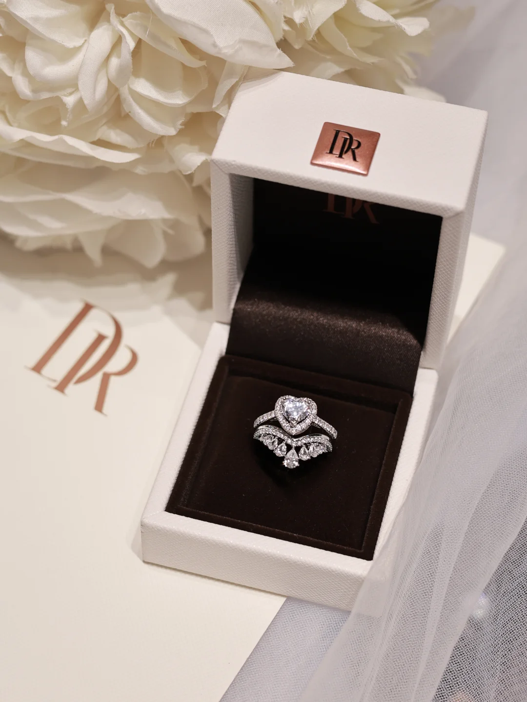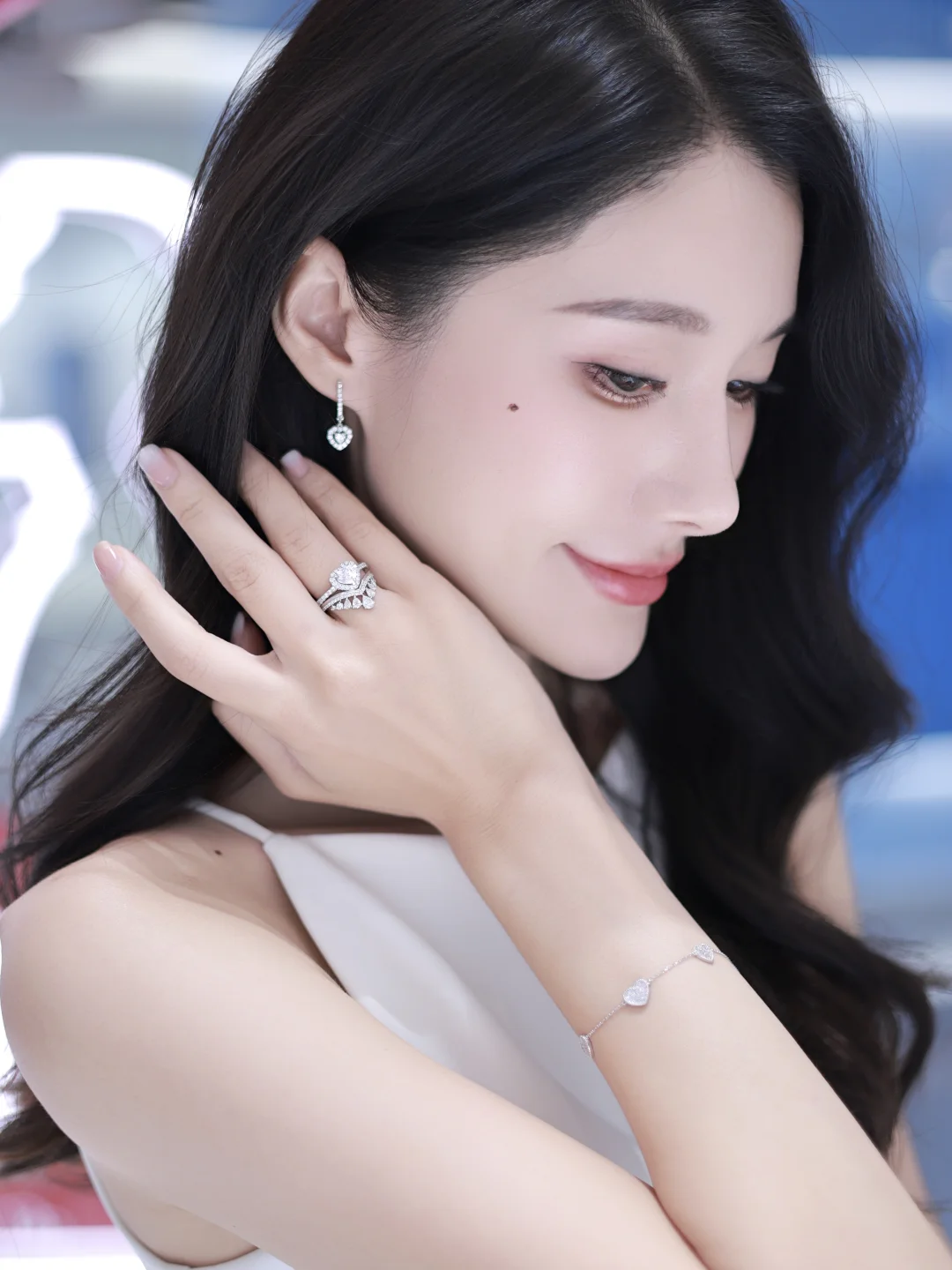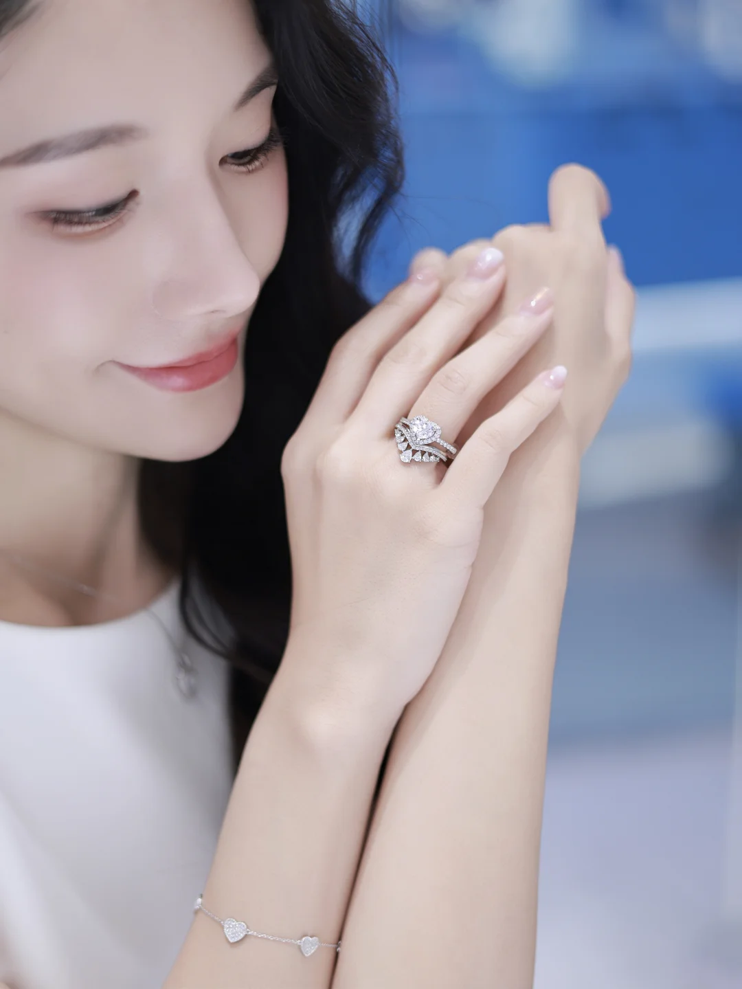 主戒是一颗精致的心形钻石,寓意爱的笃定与温柔,