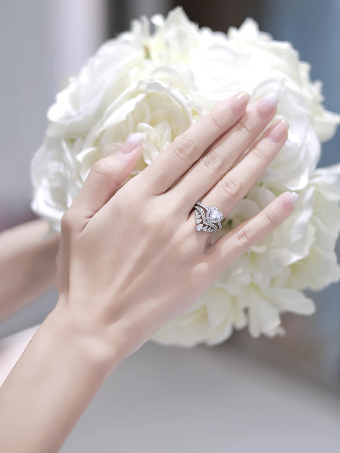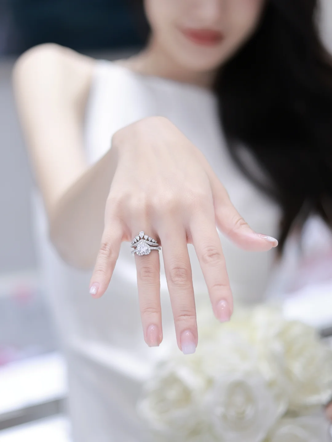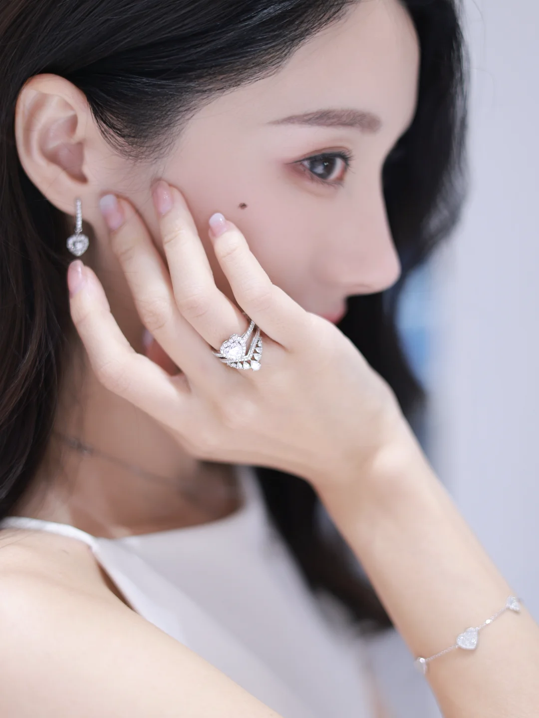主戒是一颗精致的心形钻石,寓意爱的笃定与温柔,
