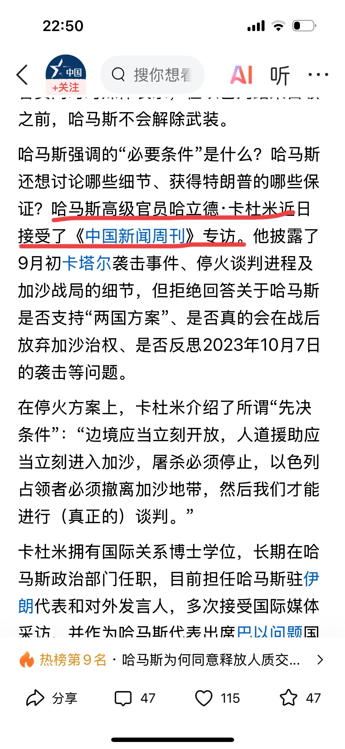 从哈马斯高级官员、驻伊朗代表卡杜米接受《中国新闻周刊》专访的谈话内容看,哈马斯同意交换人质其实是慑于特朗普威胁的缓兵之计,哈马斯依然不解除武装、依然不支持两国方案、依然不放弃加沙治权、依然不承诺放弃恐怖。 特朗普的20条的实际意义在于换回人质以及在彻底消灭哈马斯的问题上堵住了更多穆斯林和阿拉伯国家的嘴!批判的武器代替不了武器的批判,物质的力量还是靠物质来消灭。丧钟已经为哈马斯敲响!