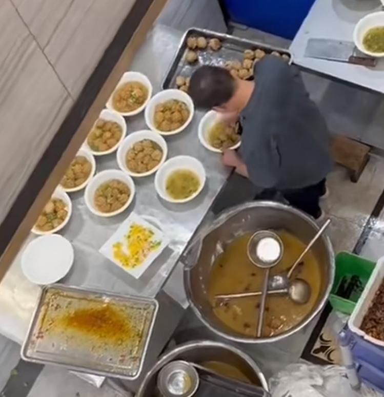 这就是你们爱吃的徒手回锅丸,完好无损原封不动的又回到托盘里,等着二次装盘。看看那一份份基本没动筷子的丸子,商家本着能节约就节约,能不浪费就不浪费,直接开启回收模式,并且还是亲自用手掏出来的,保证干净卫生,回锅后味道可能更好。番茄山药丸子 紫薯丸 牛肉丸炒青椒 垫步油炸丸子 丸子取碗夹 鲜肉手工丸