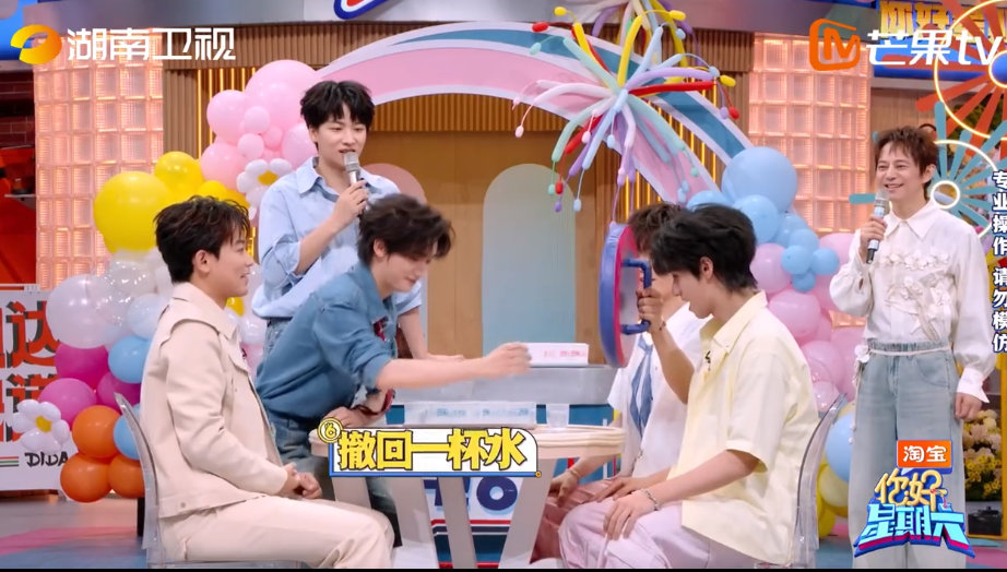 丁程鑫哥友力这一块你好星期六游戏中丁程鑫成功攻击后要对朱志鑫泼水,手刚抬起又放