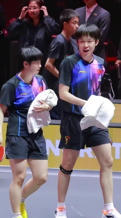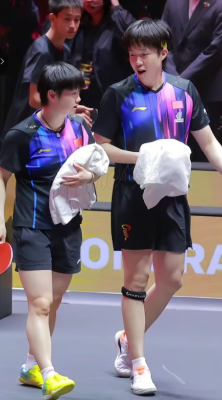 混双完赛,头哥递完毛巾给莎莎,两人抱着毛巾一边走,头哥一边笑着跟莎莎说着什么,反正把莎莎逗笑了!
