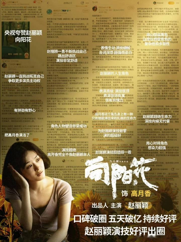 赵丽颖向阳花收视破2登顶向阳花是清明档票房冠军,也是春节档后首部破2亿电影,今天上线央六电影频道开播半小时就破2登顶全频道第一。向阳花演员演技好,故事流畅,剧情好看,赵丽颖的观众缘特别好。也期待下赵丽颖的待播剧《造城者》