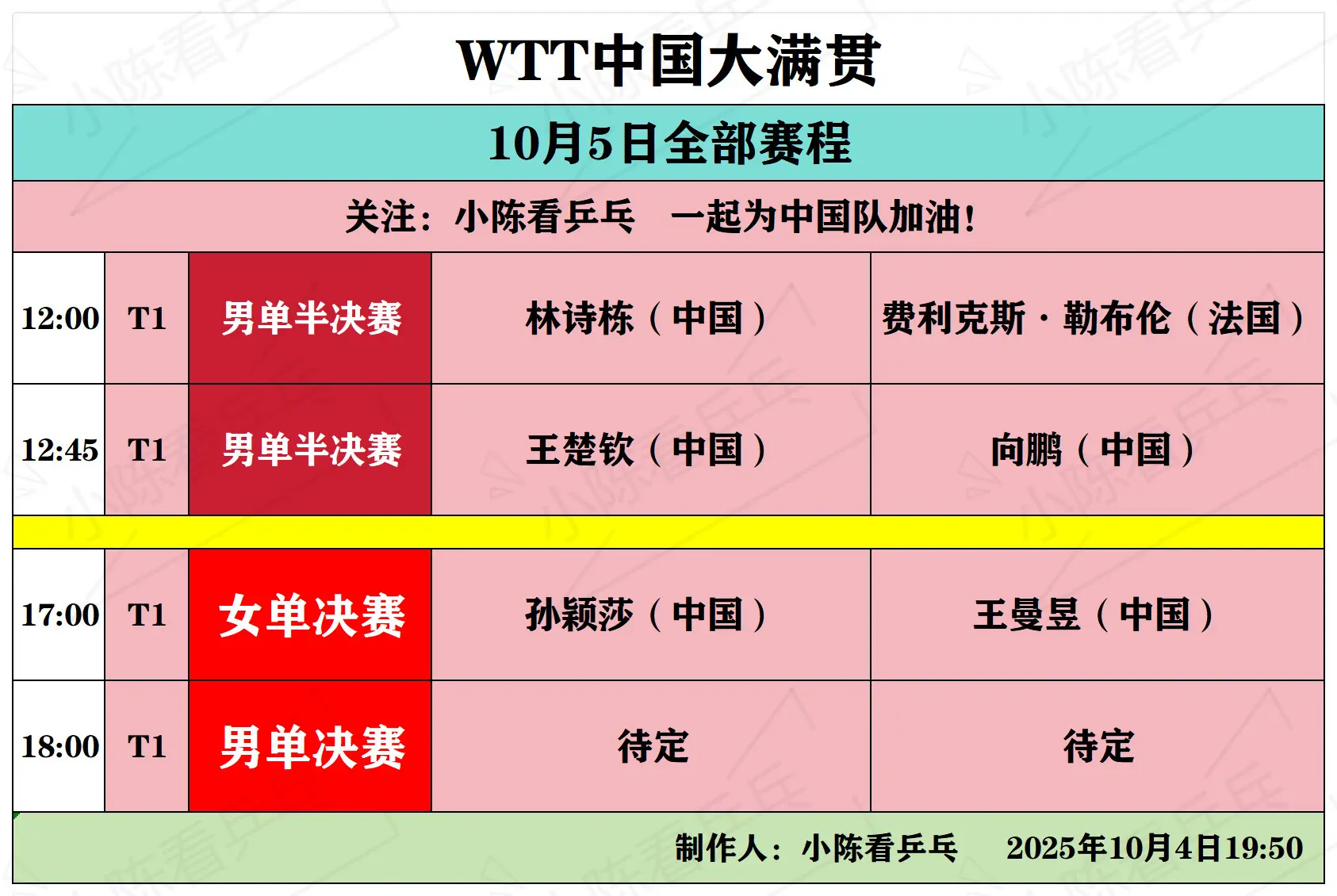 WTT中国大满贯10月5日全部赛程。WTT中国大满贯10月5日全部赛程,男单半决赛,男女单打决赛,女单决赛中国队内战,孙颖莎VS王曼昱,中国队继续加油。