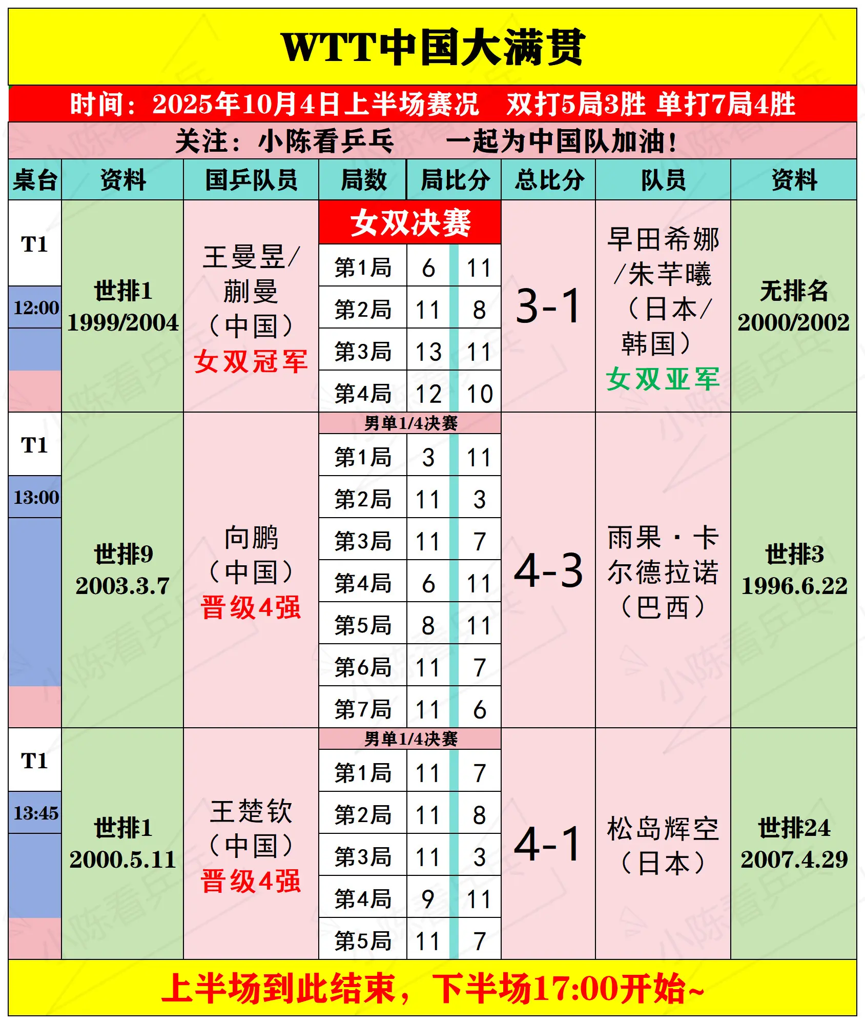 WTT中国大满贯10月4日上半场比赛结果。WTT中国大满贯10月4日上...
