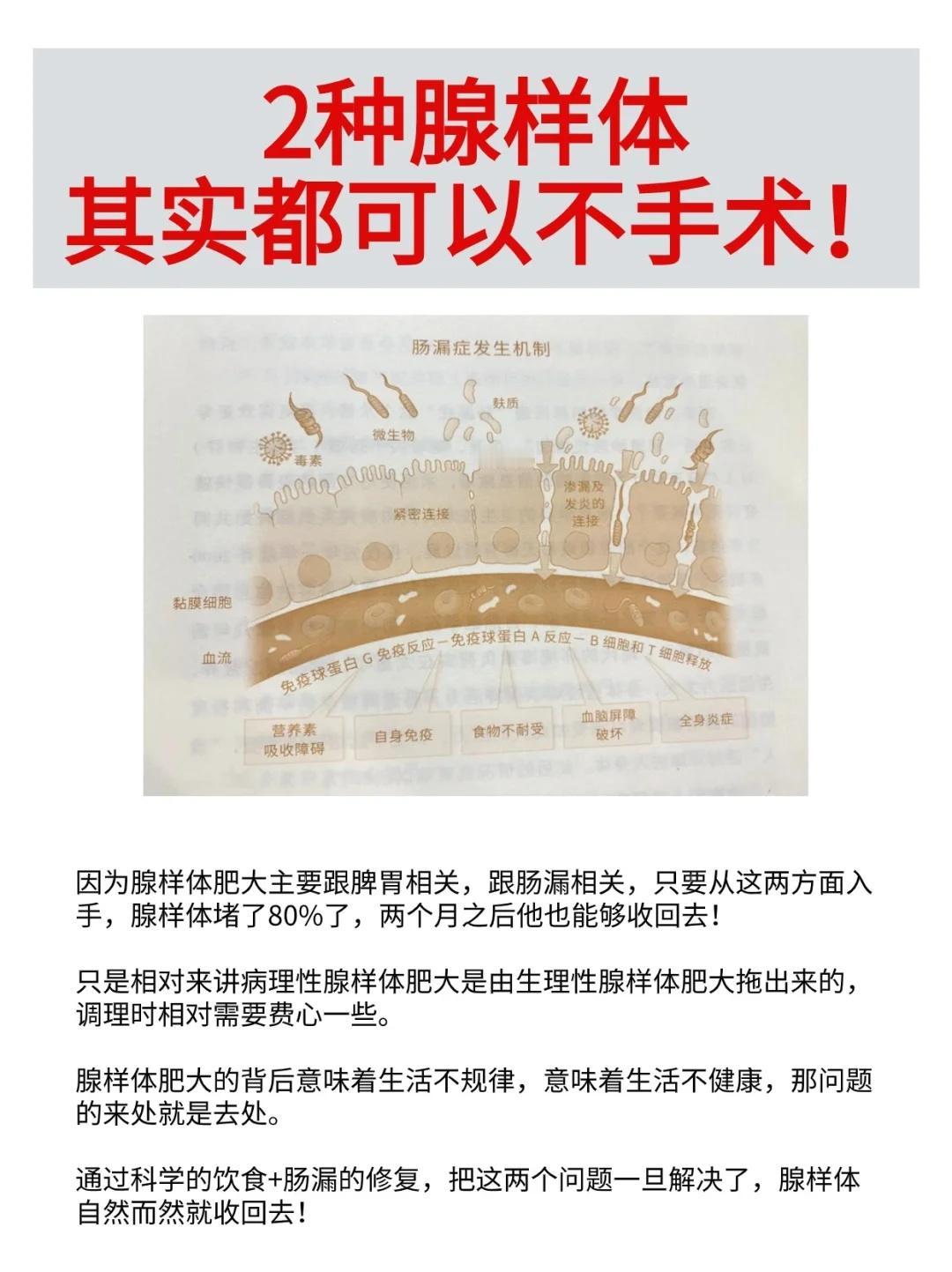 孩子腺样体,都是是拖出来的!90%不用手术! ✅腺样体两个时期 1、生理性的肥大 2、病理性的肥大 我们每个人从出生他都是自带腺样体,而且它是随着人体的年龄的增长而去生长发育的。 2-4岁属于腺样体的生长期 6-7岁属于腺样体的旺盛期, 9岁属于腺样体的收缩期 ⭕️腺样体病程要经历七年的时间(这也是为什么腺样体难治的原因) 我们现在大部分人的营养其实都是偏于过盛,所以小孩在稍微胖一点,一般检查的时候都会有腺样体肥大的问题。 问题不大,医生也会告诉你没关系,基本上这个生理性的肥大都可以自愈。 但是有一种情况,病理性的腺样体肥大家长一定注意! ❌比如说这个孩子伴有过m性体质的情况是不可能自愈的,因为它有很多潜在的风险,不断的刺J腺样体,每刺J一次腺样体就会增长一次。 那经过反复这样的刺J,本来是一个生理性的腺样体肥大,最后变成了一个病理性的腺样体肥大。 腺样体肥大主要跟脾胃相关,跟肠漏相关,只要从这两方面入手,腺样体堵了80%了,两个月之后他也能够收回去,腺样体肥大的背后意味着生活不规律,意味着生活不健康,那问题的来处就是去处 还是那句话怎么调?解决腺样体问题,终归要回到生活中调理脾胃修复肠漏吧,不可能是切了就能解决问题的
