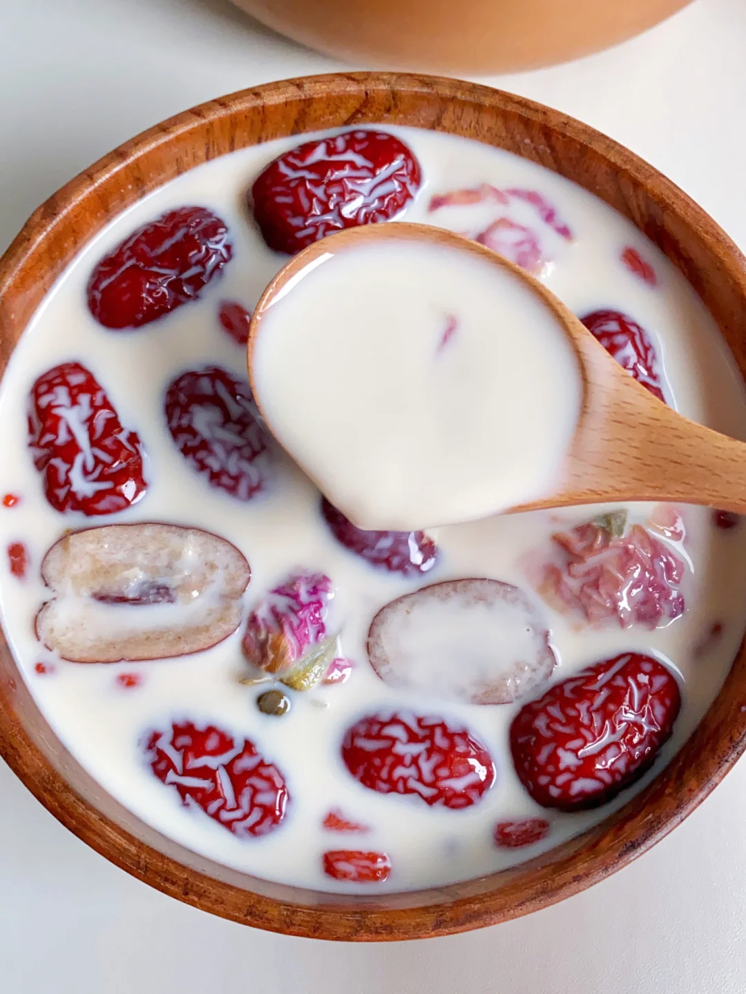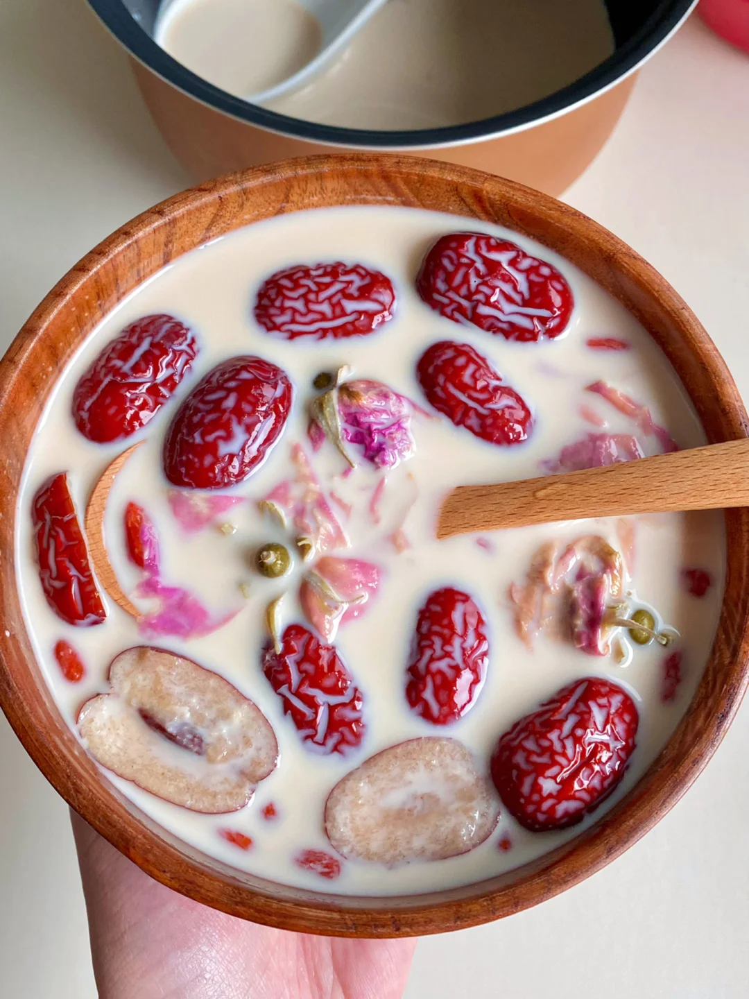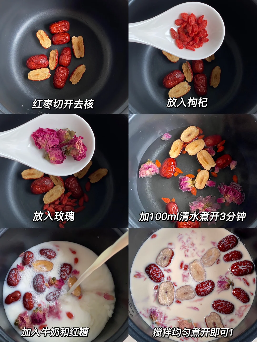 红枣牛奶茶暖乎乎的!女生喝真的很好!! 做法简单!!经常喝🧏🏻♀️红润润的!! 奶香贼浓郁!香甜可口!营养又健康!! 📝食材:红枣、枸杞、玫瑰、红糖、牛奶 🥣做法:红枣切片去核,和枸杞玫瑰放入锅中加100ml清水煮开3分钟,再加入红糖和牛奶搅拌煮开即可 都是些健康友好的食材!煮过后奶香更香醇了!!生理期就馋这一口,比奶茶还要好喝!还有淡淡的玫瑰香!喝一碗,元气满满![派对R][派对R]