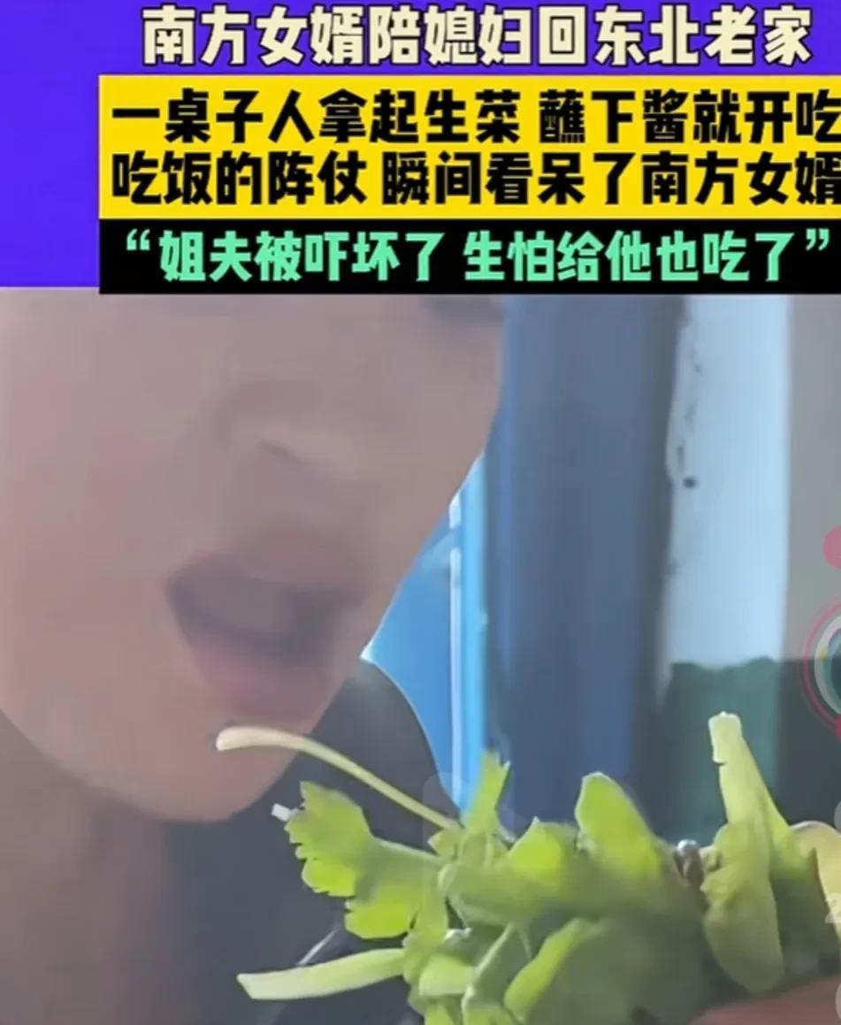 南方女婿陪媳妇回东北老家,一家人拿起生菜蘸着酱开吃,瞬间看呆了南方女婿! 小姨子打趣道:“姐夫被吓坏了,生怕给他也吃了”! 南方网友看到视频后,大部分人说不理解,为啥就不能炒熟了吃呢,非得吃生的,不怕有虫子吗? 还有人也是开玩笑似的说,绿化带都被你们啃光了! 也有到过东北的南方网友说,其实东北的菜生吃甜滋滋的,和南方的大不同,南方的发苦,可能是气候原因吧! 东北大部分网友解释说,我们这里生吃的菜,基本都是天然绿色蔬菜,都是自家小菜园种的,不打农药,不泼大粪,基本也没虫,在就是气候原因,所以生吃味道好。 只能说,一方水土养一方人,应该尊重每个地方人的饮食习惯!