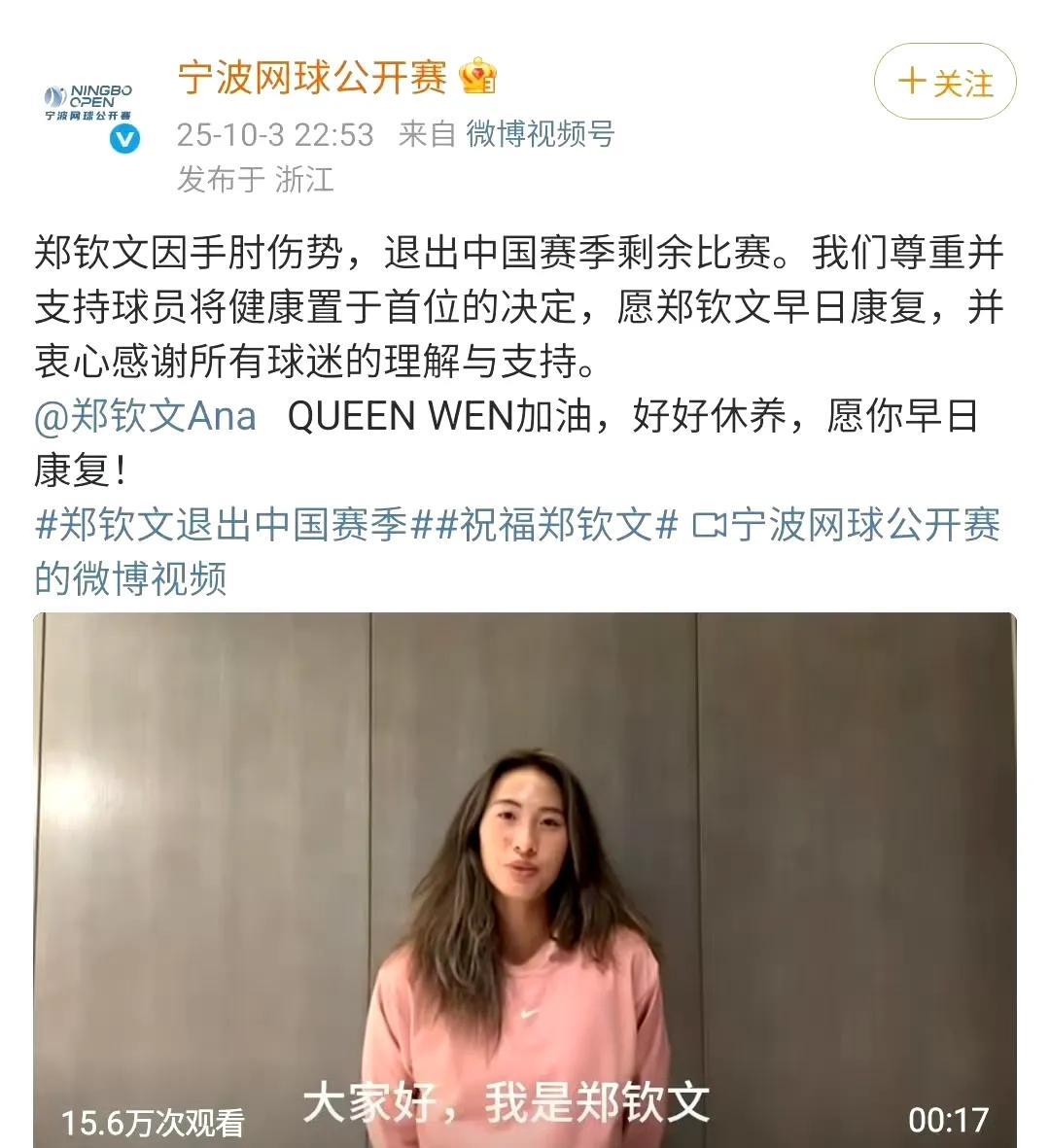 意料之中,郑钦文宣布退出武网、宁网! 她说,一直希望在家乡打出最好的网球,但伤病
