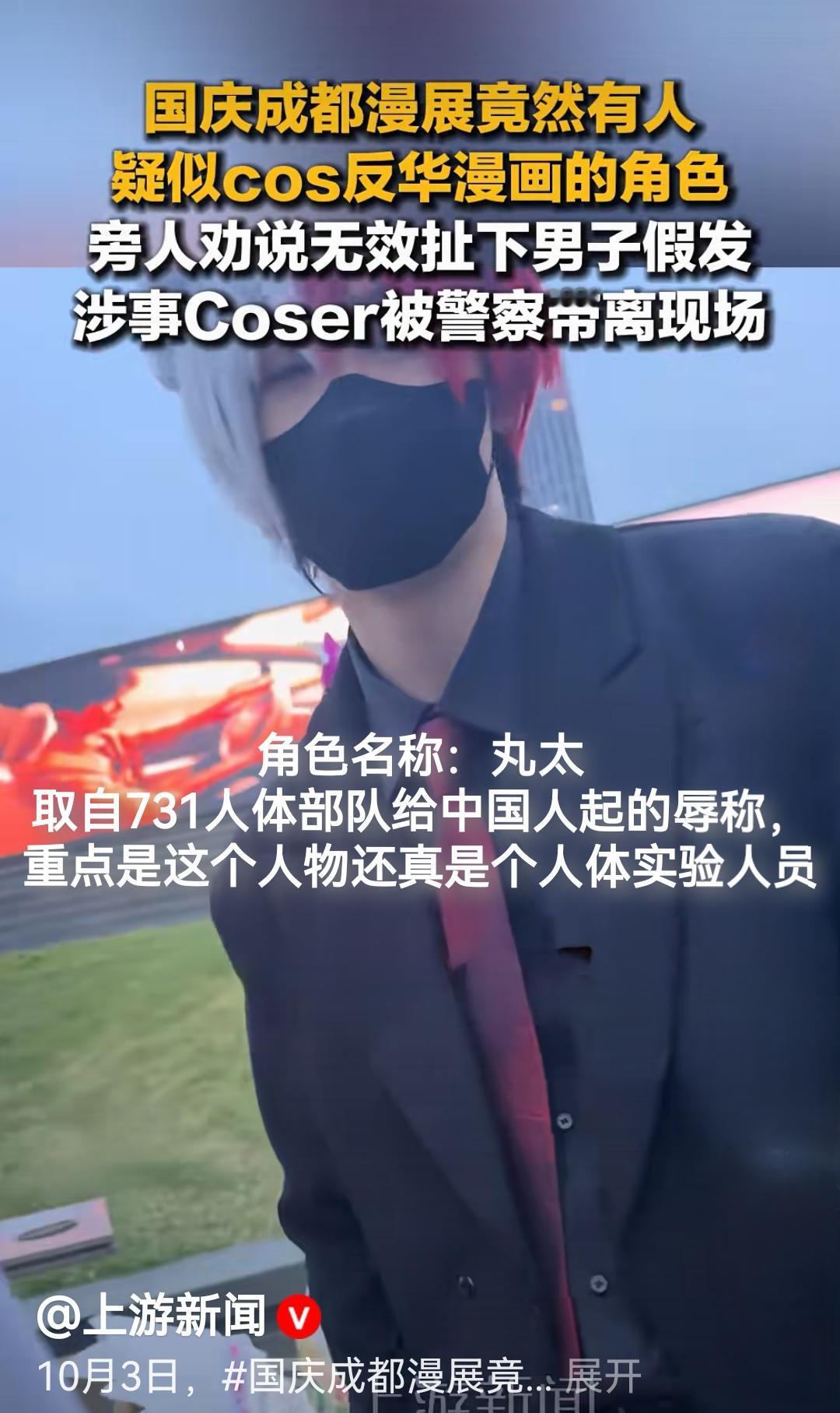 爱国是所有行业的底线, 对国外文化角色喜爱无人反对, 但是请不要用你的喜爱,来侮辱中国人。 老百姓朴素的爱国主义情怀, 是不容被践踏的。 “丸太”这个角色取自731人体实验部队对中国人的辱称, 这部漫画多年前已被曝辱华。 而这个角色在漫画中就是人体试验员, 如此有针对性的辱华角色, 作为动漫喜好者能不知道吗? 然而却要扮演这个角色, 可想而知,这个人绝对是有意为之! 被人指责之后,竟然敢动用刀子伤人,坚决不能轻判它!