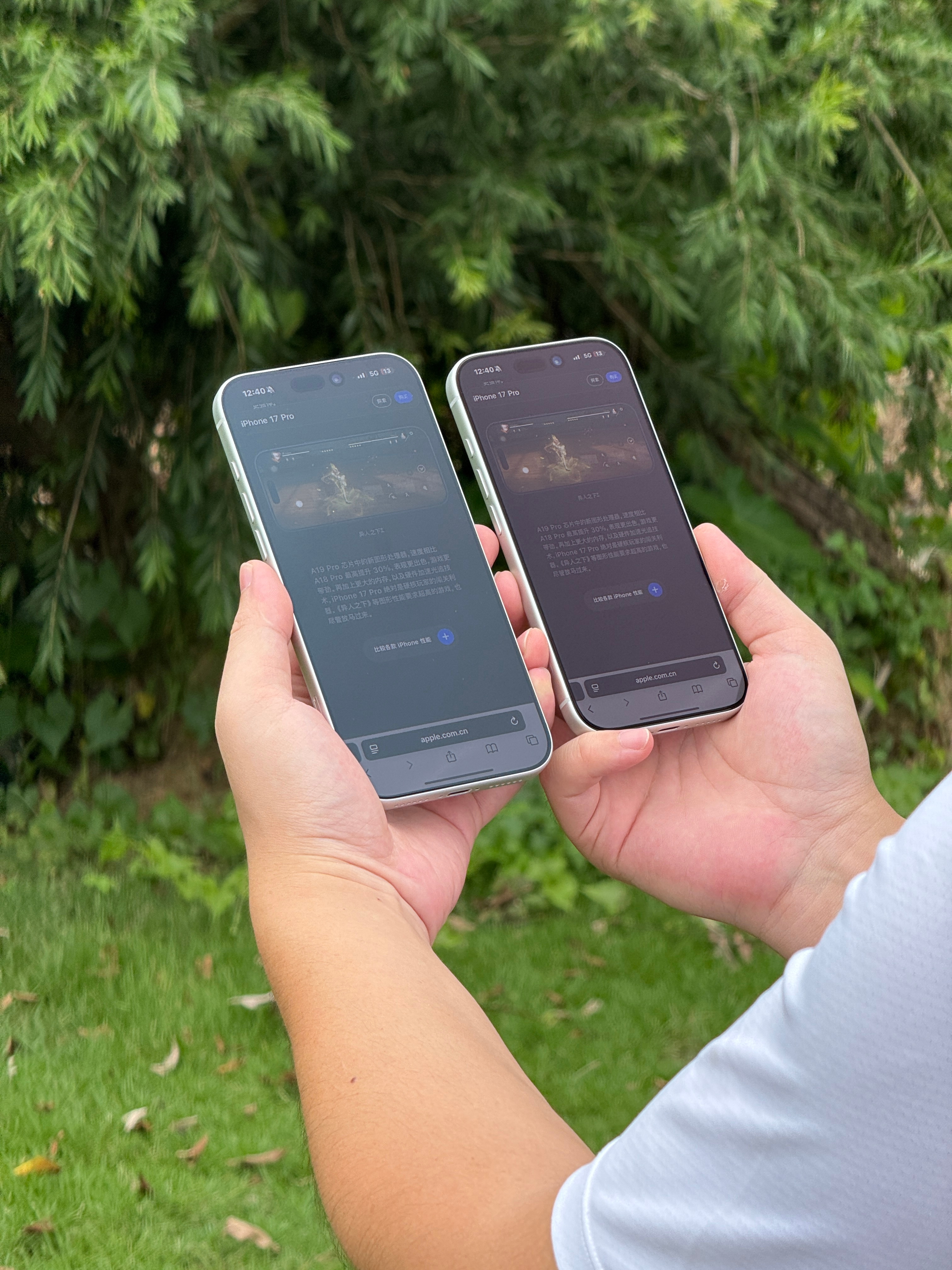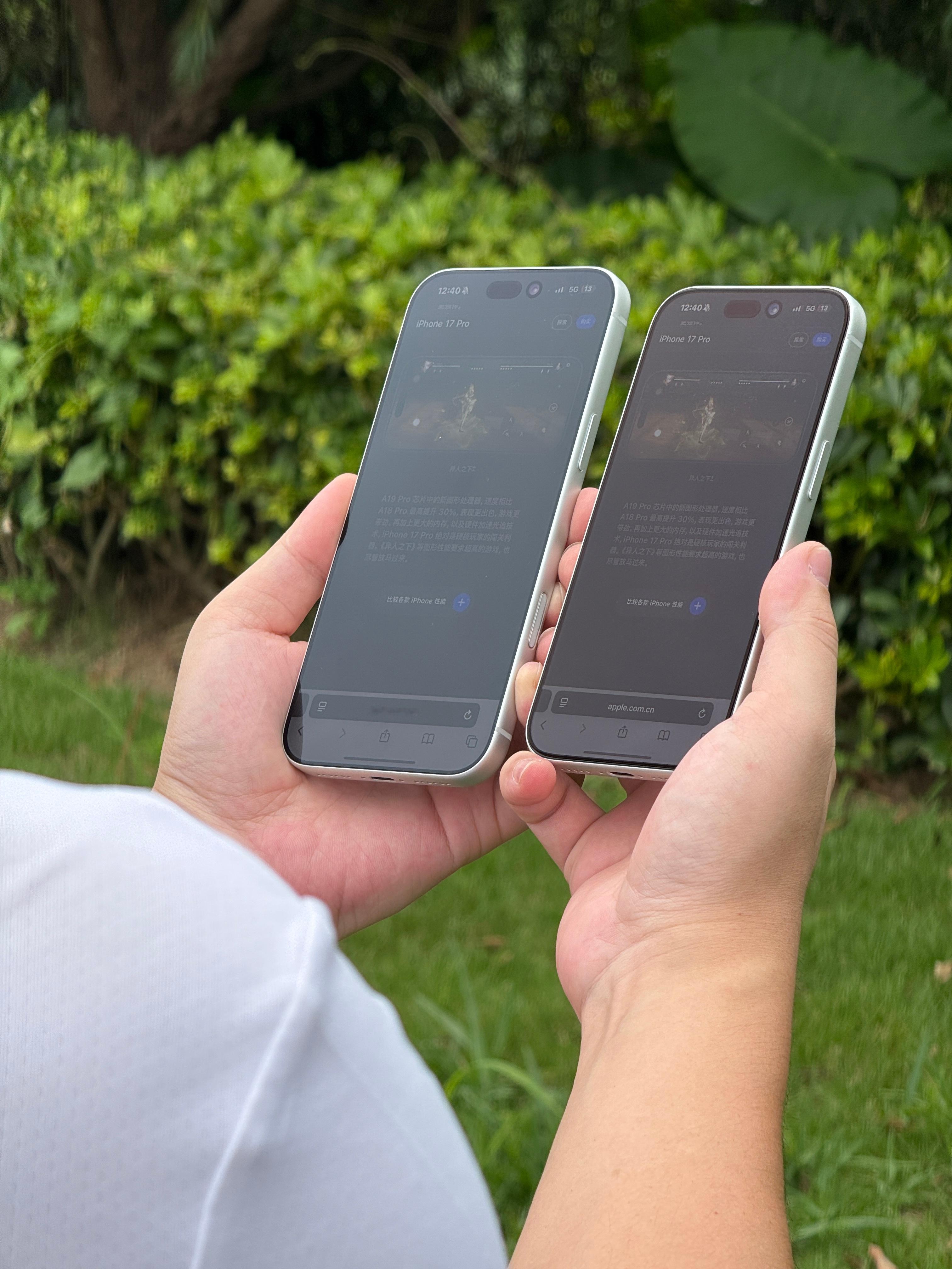左边的是 iPhone17ProMax 裸机无膜,原机屏幕有抗反射涂层,右边是贴上我们 AR 热弯3D 玻璃膜后的效果。