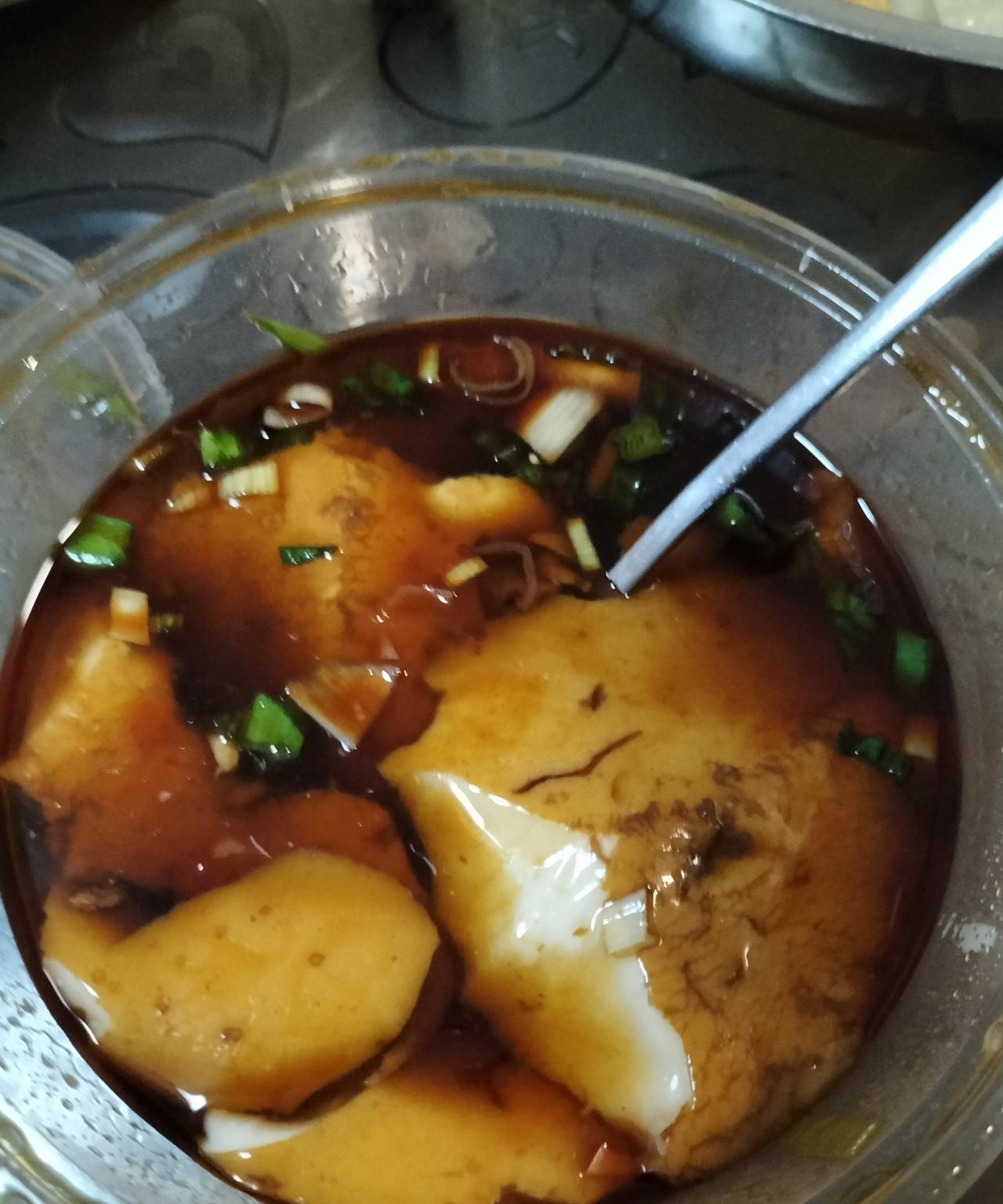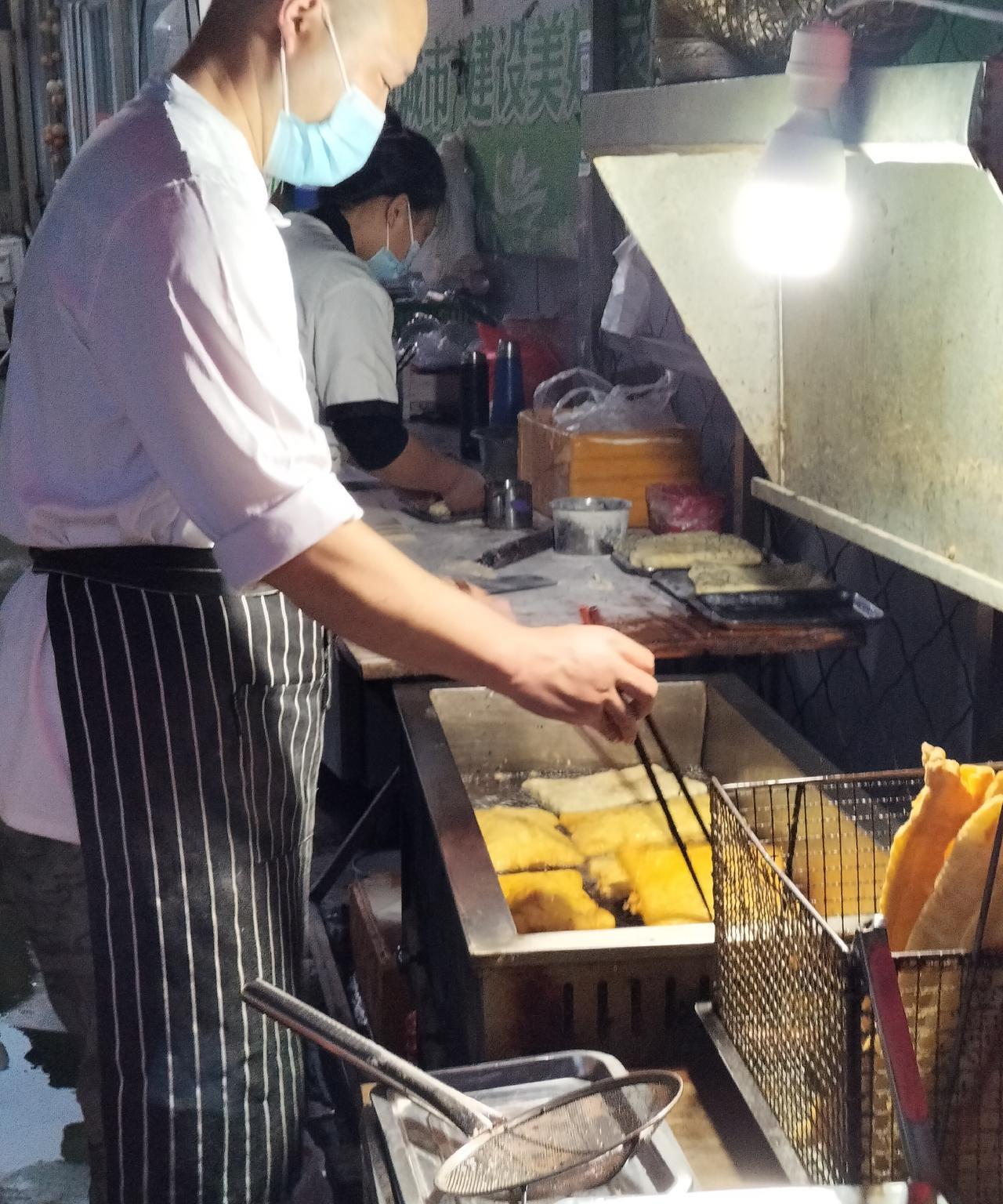 在聊城街头有种特色小吃,德州没有。 豆腐脑,油条,炸老虎都和德州早点一样。 高唐老豆腐,棉籽油汤味儿也差不多。 老虎皮儿上撒芝麻,倒是德州老虎没有的。 聊城早点里,有一种叫呱嗒的小吃德州没有。 面皮儿里包五花肉馅儿,状如长饼,油煎炸。 压面皮儿时,擀面杖击打面板,发出呱嗒呱嗒声,得名——呱嗒。 肉香,油香,配上一碗胡辣汤,热热乎乎,香辣可口。 油条豆浆,老豆腐火烧,拉面鸡蛋,甜沫果子,呱嗒糊辣汤。 都是绝配。