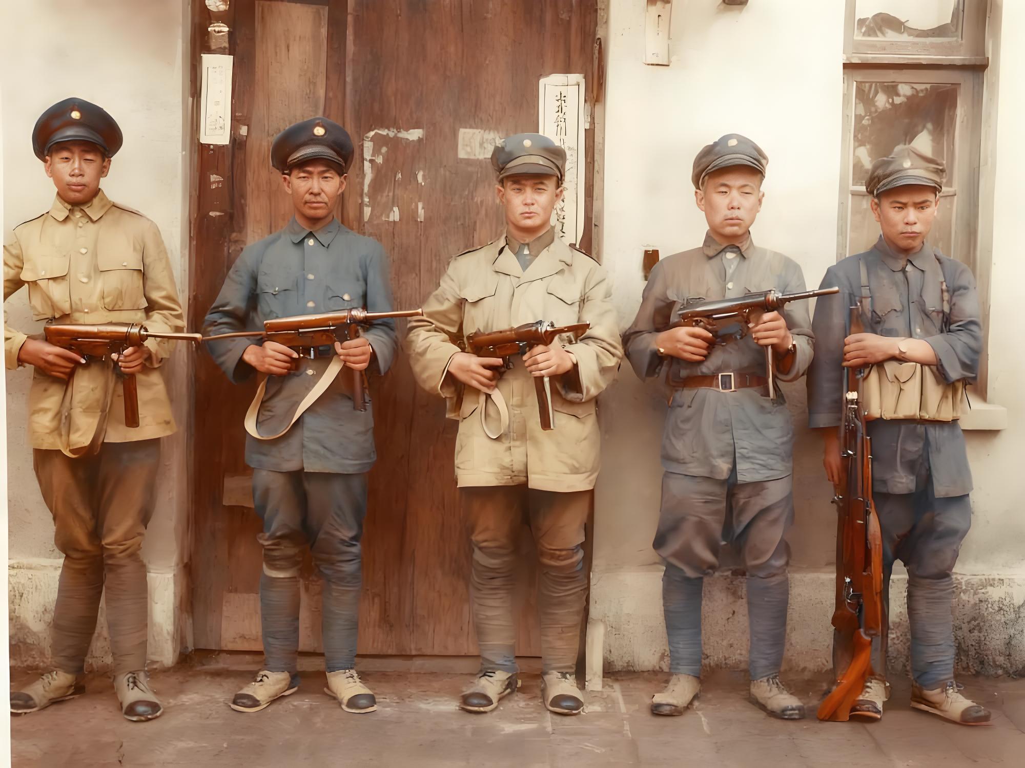 这张拍摄于1949年的照片,定格了数名国军士兵的集体留影。画面里,他们整齐列阵站立,手中紧握着武器。士兵们个子普遍不高,其中还有一位士兵呈现出螺旋腿的模样,在队列中格外引人注目。