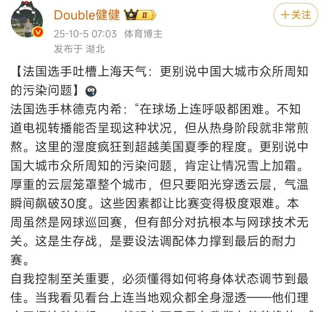 来上海参加2025网球大师赛的法国选手林德内克希,自己水平不行,体力不行,反倒把失败的原因归结于上海的气候和空气质量。 他吐槽说,上海的气温高,湿度大,更别提中国大城市众所周知的空气污染问题,这些因素让他感觉是雪上加霜,这已经与网球技术无关,而是一场“生存战”。 上海气温高湿度大是事实,但上海哪来的空气污染?连气候与空气污染都分不清的人,有什么资格发牢骚说怪话?也不嫌自己的言论丢人? 自己水平不行,身体素质又差,干不过别人,却将失败的原因归结于天气,甚至无中生有地扯上空气污染,这个白皮抹黑别人的能力远远超过他的网球水平。 建议以后中国举办的网球比赛不要再让他来了,万一他死在比赛球场上,还会带来麻烦。这样的货色中国不欢迎,你觉得哪儿凉快就哪儿呆着去。