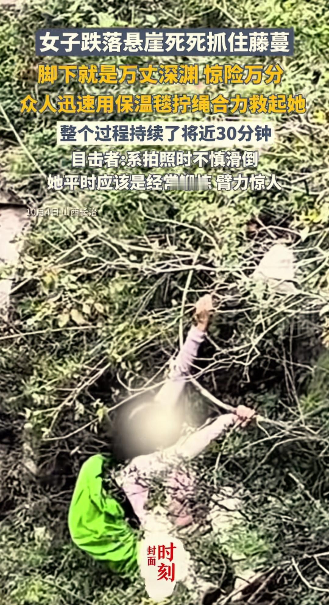 女子拍照时不慎滑坠下山崖,她本能反应下,死死抓住了崖壁上的藤蔓,向上面的人呼救。