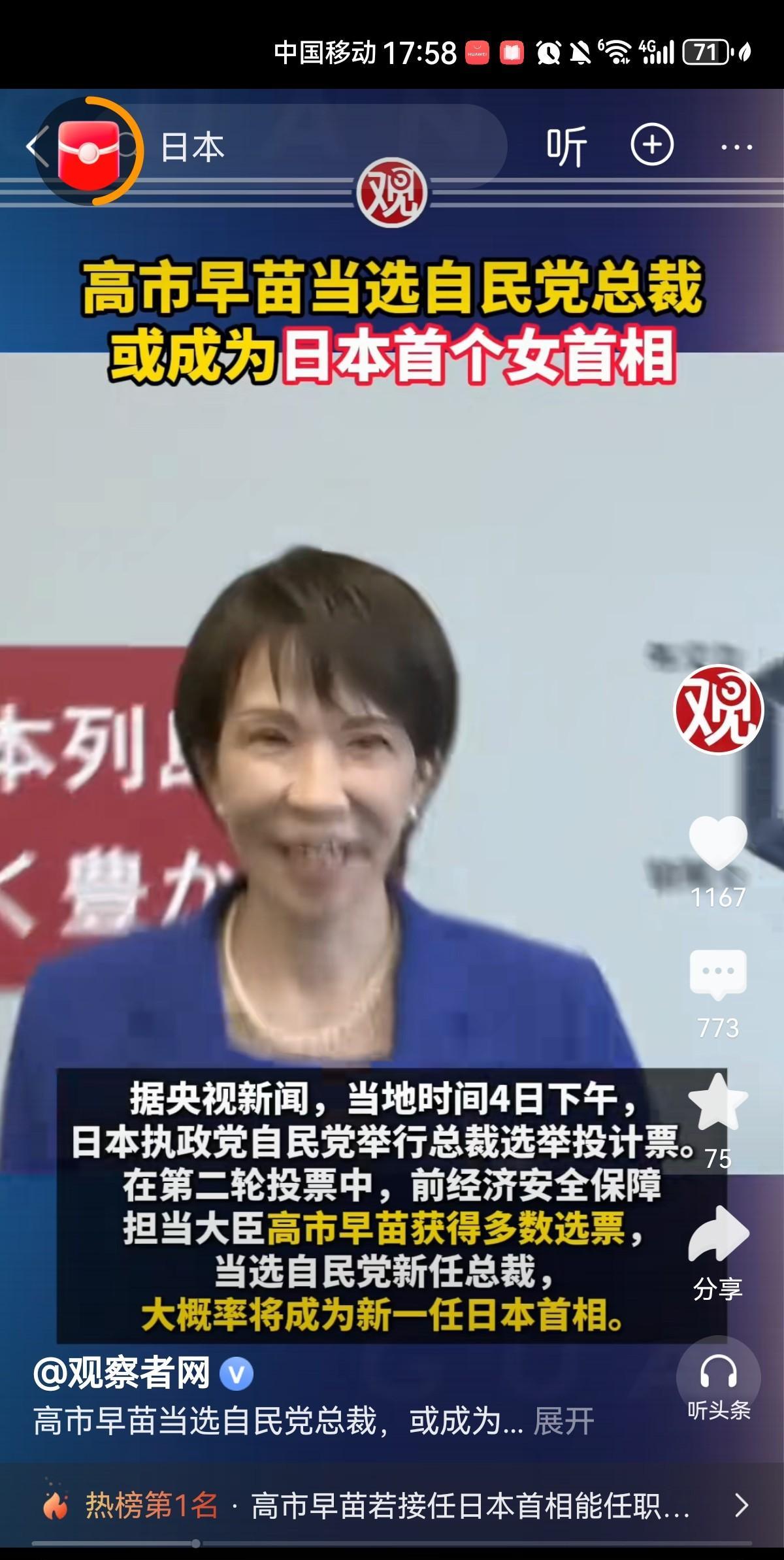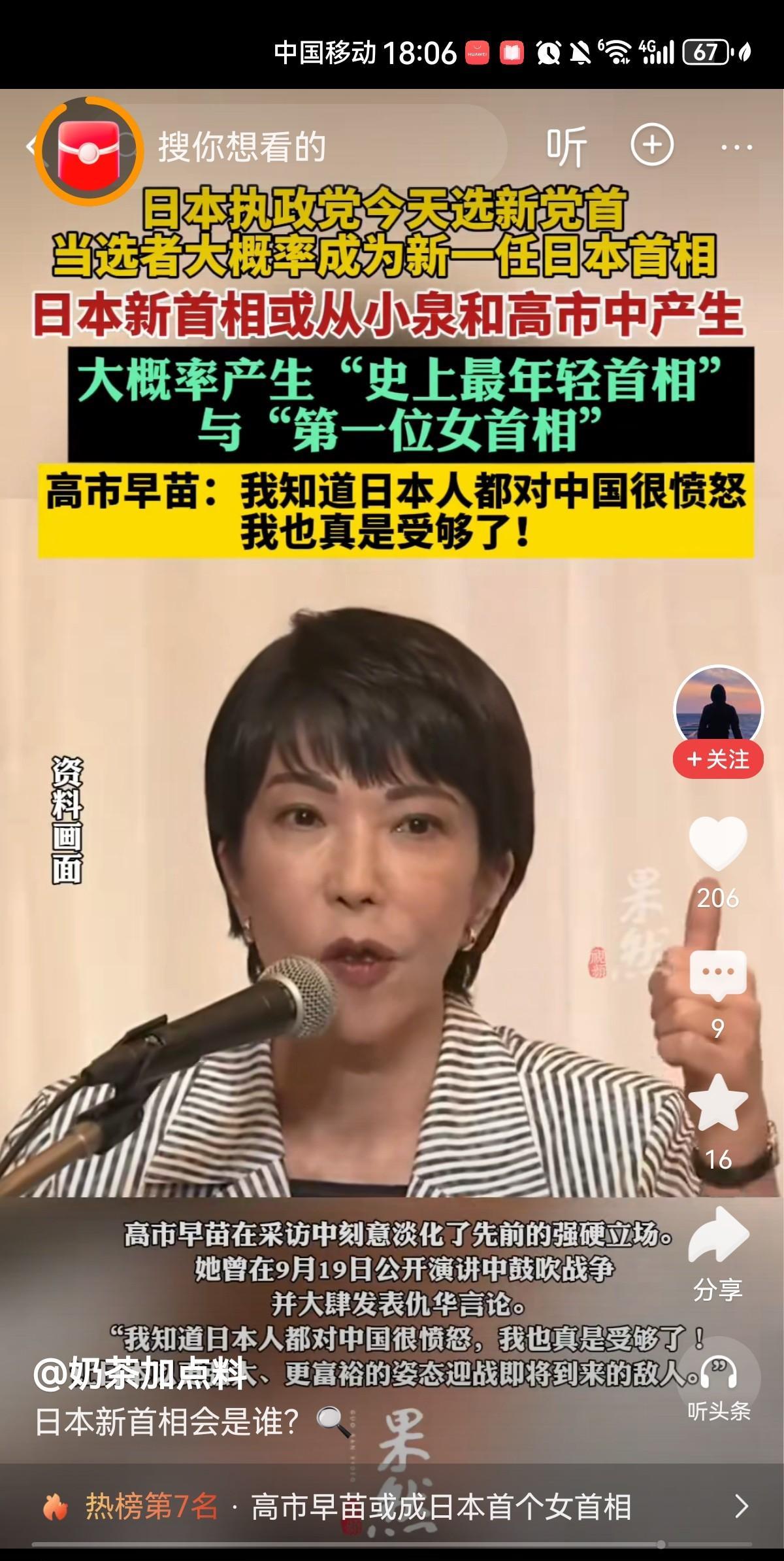 女版“安倍”:极右翼鹰派人物,绝非善茬,我对中国受够了… 日本政坛风云变幻,“女版安倍”高市早苗成为日本首位女首相。她于1961年出生在普通家庭,年轻时热爱音乐,还组建过重金属乐队,立志成为像撒切尔夫人那样的政治家。在安倍的提携下,她的从政之路一帆风顺,创下诸多女性纪录。 然而,单看她的面相,便知她绝非善类。她多次抹黑中国,其行径与安倍晋三如出一辙。无论谁担任首相,不过是执政时间长短、政策极右或极左的差异罢了。 ∽end~ #晒图笔记大赛#