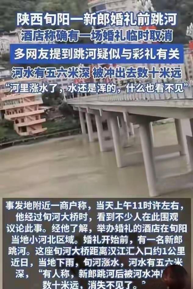 10月3日,陕西旬阳一新郎跳河自杀,知情人透露原因疑似彩礼被临时加价,新郎想不开