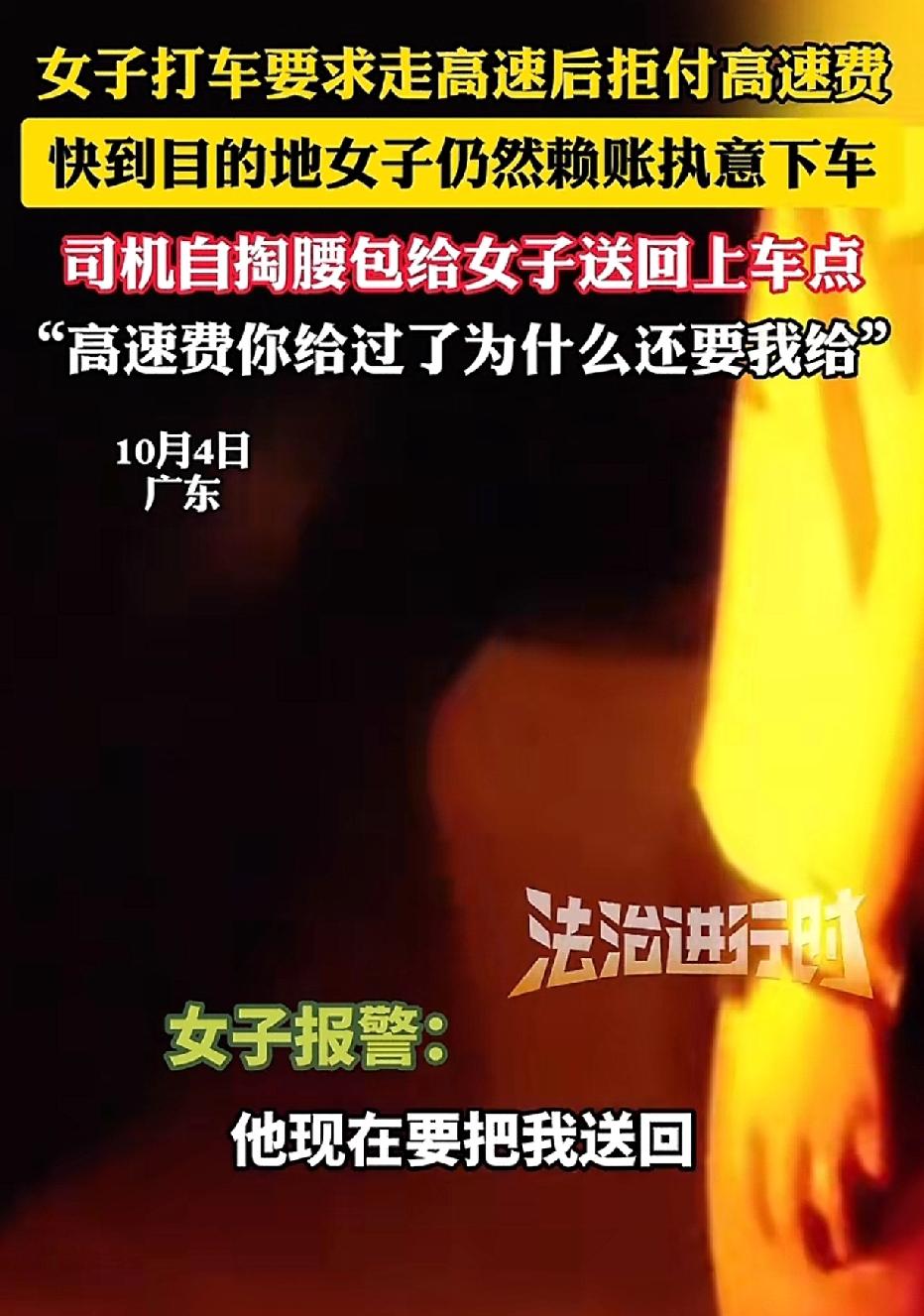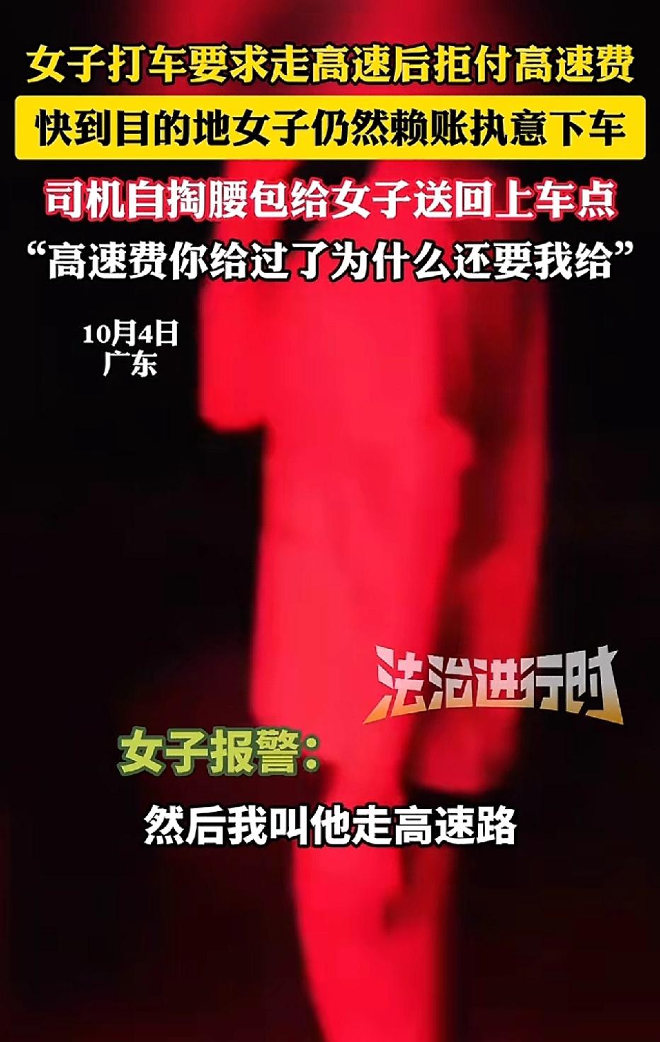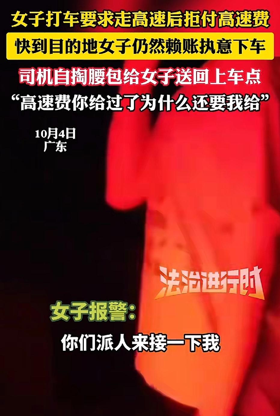 广东,一名女子打车时强烈要求司机走高速,司机便跟她说明:“走高速的话你得付高速费。”女子没有回应,司机以为她同意了,便驶上高速并先行垫付了高速费。 没想到快到目的地时,司机再次提醒女子支付高速费。 女子却对司机说:“你都已经付了,凭啥还要我给高速费?我车费都付了,不可能再给你高速费。” 实际上,每个打车软件都会提醒乘客是否要支付高速费,司机在乘客上车时也会进行提醒。 两人争执不下,女子态度极为坚决,就是不给高速费。司机无奈之下调转车头,对女子说:“你这单我不做了,宁愿亏本也把你送回上车点。” 女子一听急了,强行打开车门要下车,司机怕出意外,赶紧停了车。 随后女子报了警,她跟警察说:“出租车跟我要高速费,你们来处理一下,还得把我送到目的地。” 这岂不是把警车也当成免费的出租车了? 司机并无过错,女子的行为也让网友大为诧异。 或许女子并不清楚,出租车上高速,乘客需支付高速费的事,才会做出这般令人发笑的举动。 来源:法治进行时