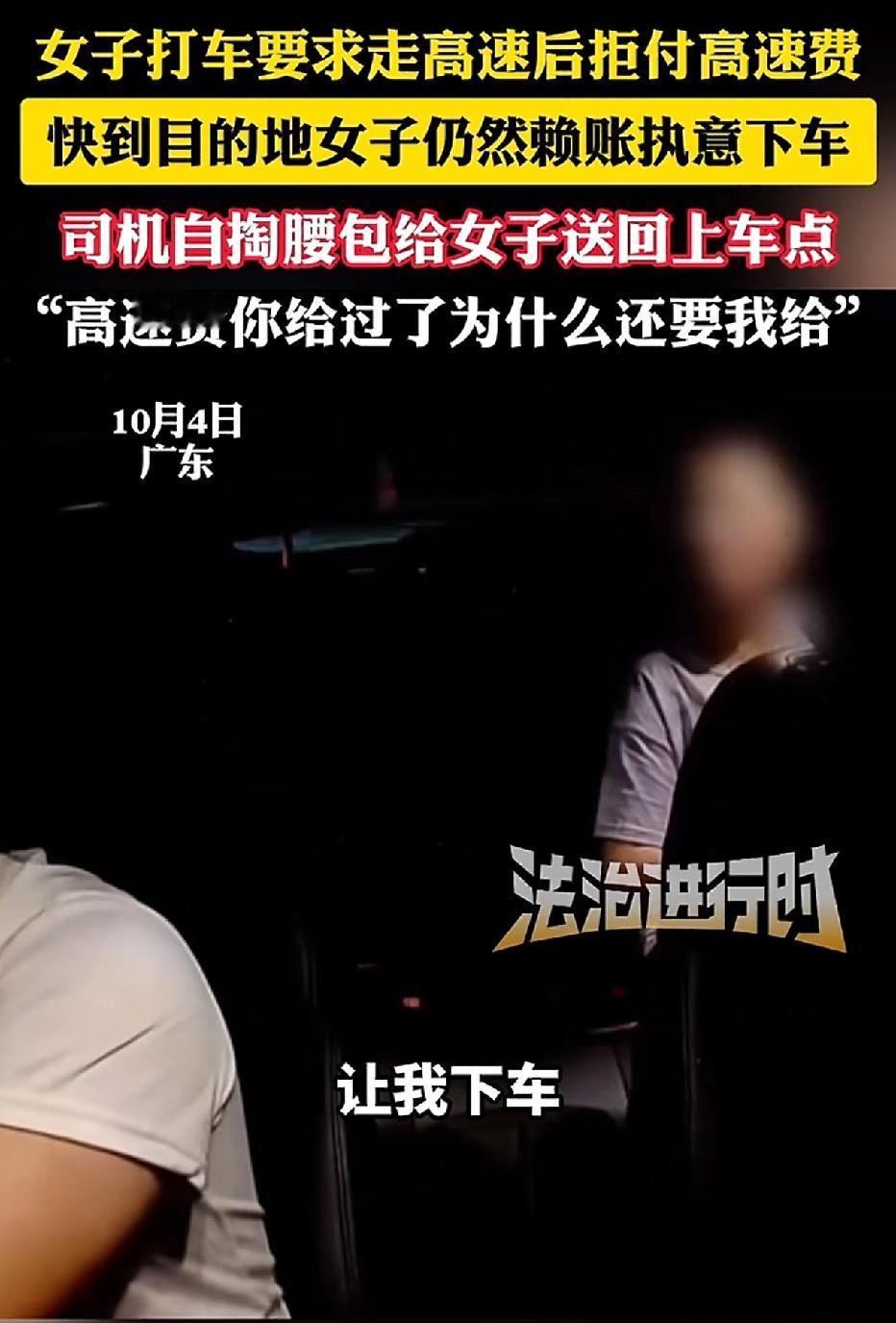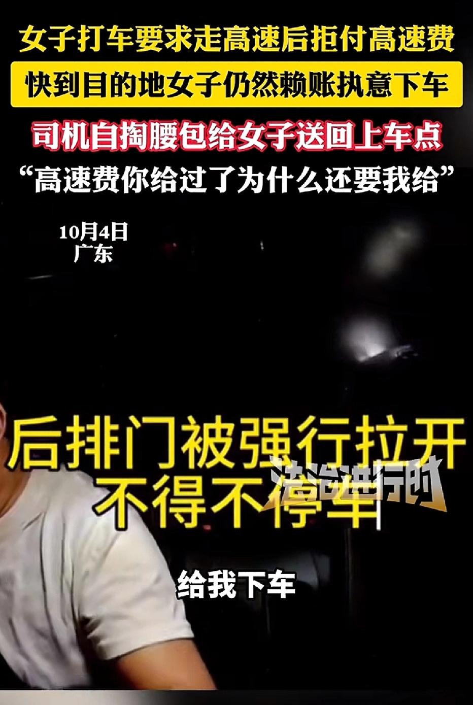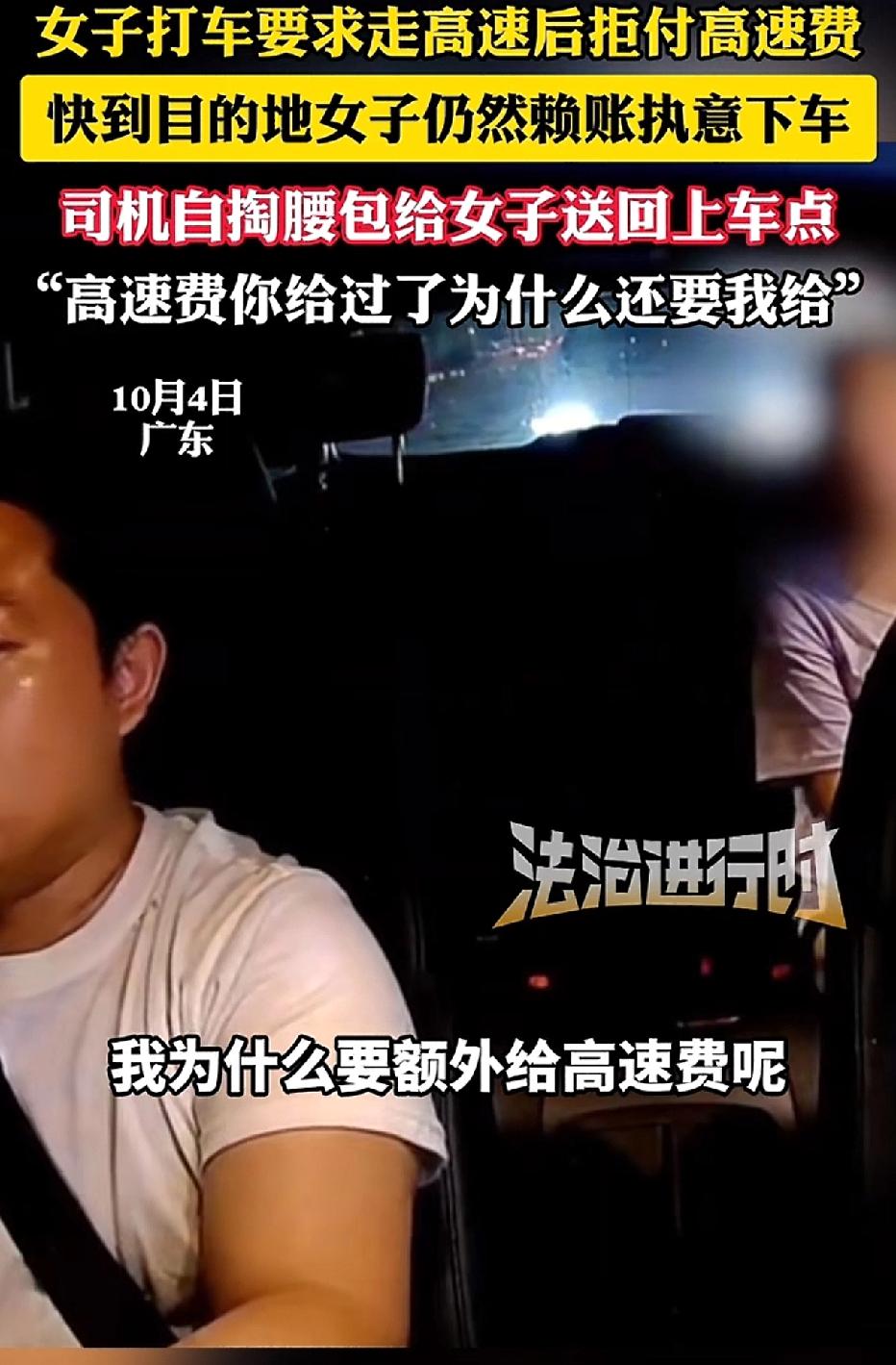 广东,一名女子打车时强烈要求司机走高速,司机便跟她说明:“走高速的话你得付高速费。”女子没有回应,司机以为她同意了,便驶上高速并先行垫付了高速费。 没想到快到目的地时,司机再次提醒女子支付高速费。 女子却对司机说:“你都已经付了,凭啥还要我给高速费?我车费都付了,不可能再给你高速费。” 实际上,每个打车软件都会提醒乘客是否要支付高速费,司机在乘客上车时也会进行提醒。 两人争执不下,女子态度极为坚决,就是不给高速费。司机无奈之下调转车头,对女子说:“你这单我不做了,宁愿亏本也把你送回上车点。” 女子一听急了,强行打开车门要下车,司机怕出意外,赶紧停了车。 随后女子报了警,她跟警察说:“出租车跟我要高速费,你们来处理一下,还得把我送到目的地。” 这岂不是把警车也当成免费的出租车了? 司机并无过错,女子的行为也让网友大为诧异。 或许女子并不清楚,出租车上高速,乘客需支付高速费的事,才会做出这般令人发笑的举动。 来源:法治进行时