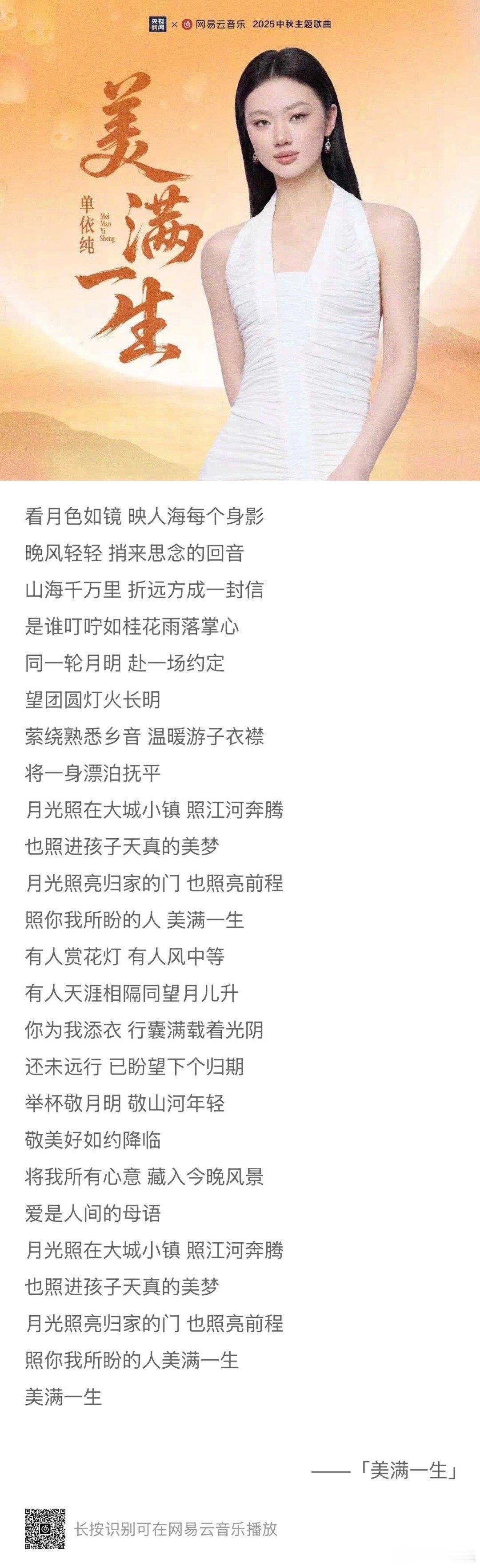 单依纯献唱央视新闻中秋主题曲 单依纯献唱央视新闻中秋主题曲!又听到单姐动听的歌声了!这次是央视新闻联合网易云音乐出品!歌曲《美满一生》也表达了游子的思念和对未来的期盼,细腻又婉转,好好听[抱一抱]