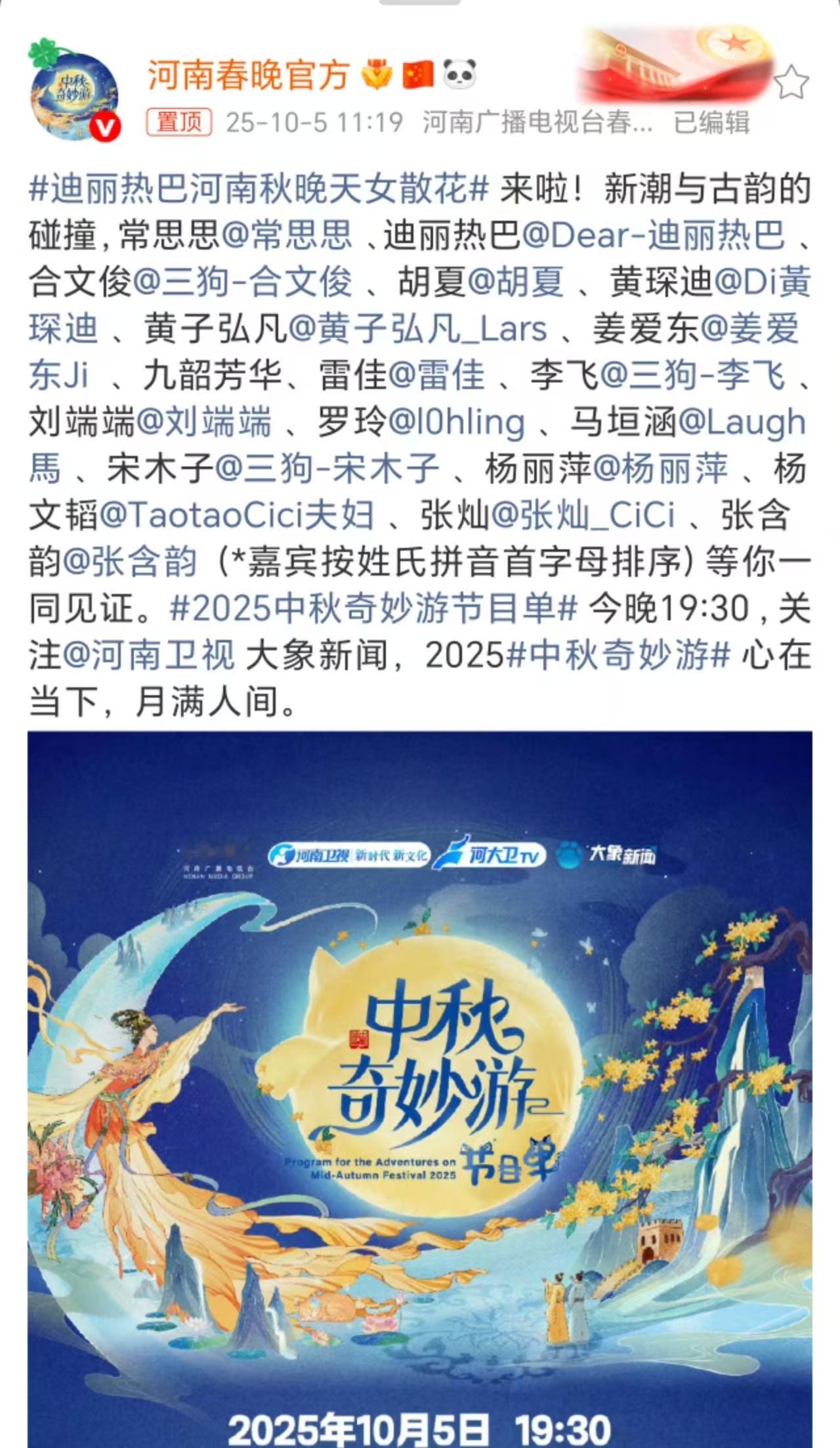 迪丽热巴河南秋晚天女散花河南卫视中秋奇妙游节目单,好多精彩的舞台啊!迪丽热巴这个天女散花,我是真的期待了,舞台造型也好美,期待今晚的舞台呈现。2025中秋奇妙游节目单