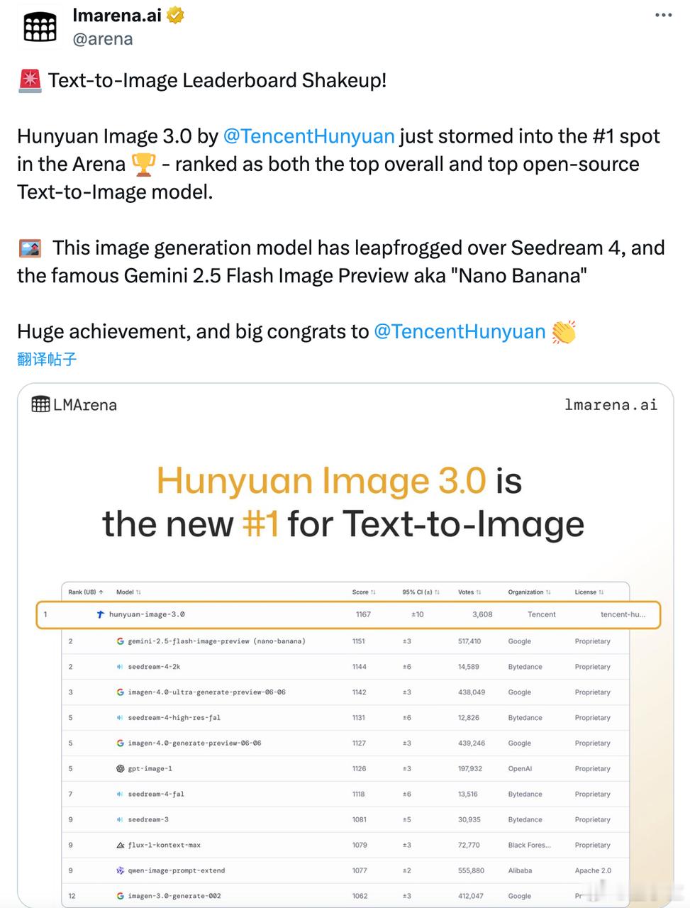 刚刚,LMArena竞技场发布了最新的文生图榜单,第一名来自中国,属于腾讯混元图像3.0!【图1】