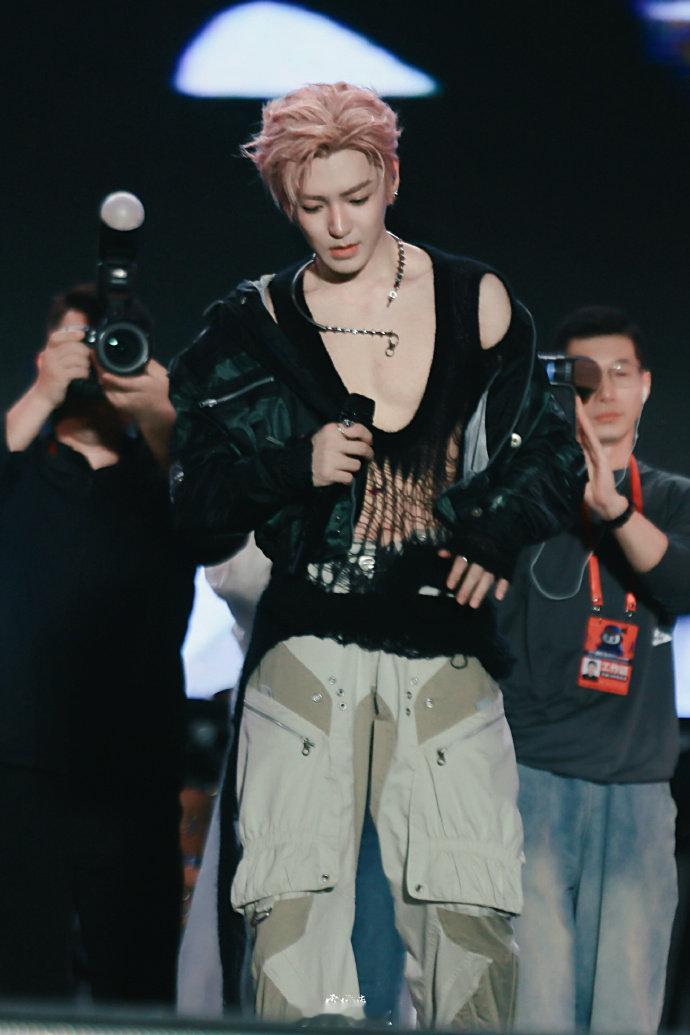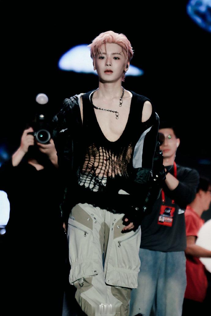 谁让侯明昊这个古人穿这些的侯明昊音乐节渔网装配粉发太绝了!演的古人角色超欲,现代造型更顶,这安排太会了!