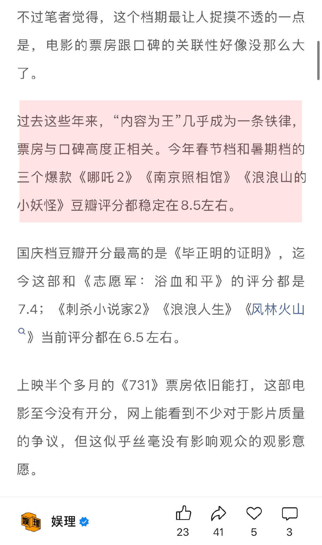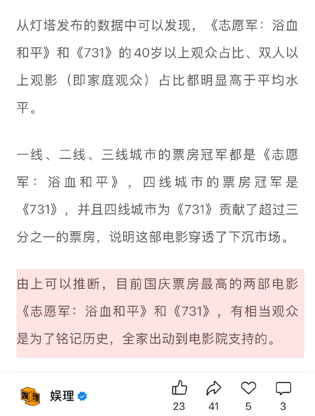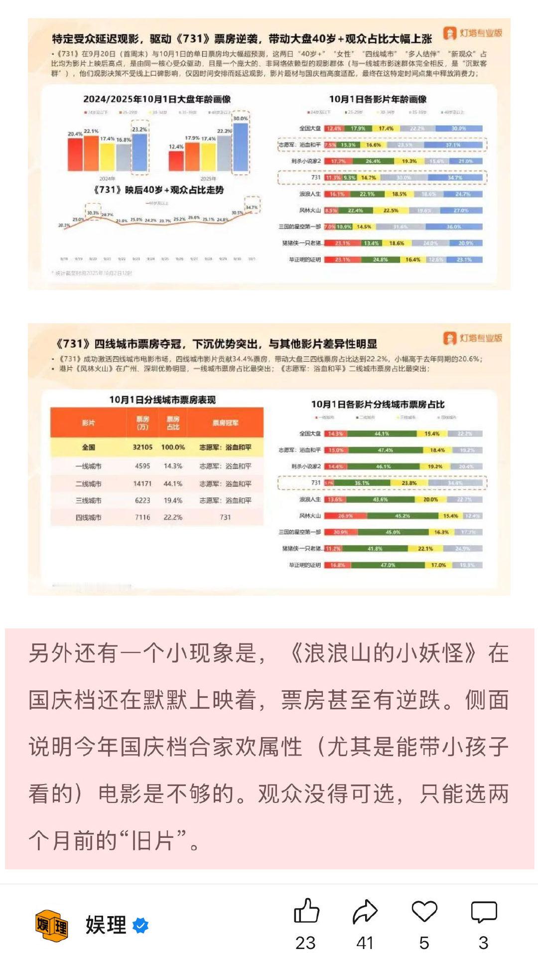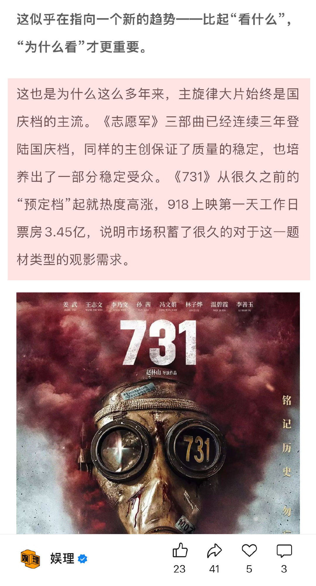国庆档最大的新鲜感是新面孔 主旋律大片始终是国庆档的主流 《三国的星空》对普通观众(低龄受众)来说,有一定的门槛的。《风林火山》一线城市票房占比非常高,说明有一小部分影迷一直在等待它上映。《毕正明的证明》算是今年国庆档题材类型让人眼前一亮的一部,但破圈受阻,一个最显而易见的原因就是片名太文艺了…娱理独家↓