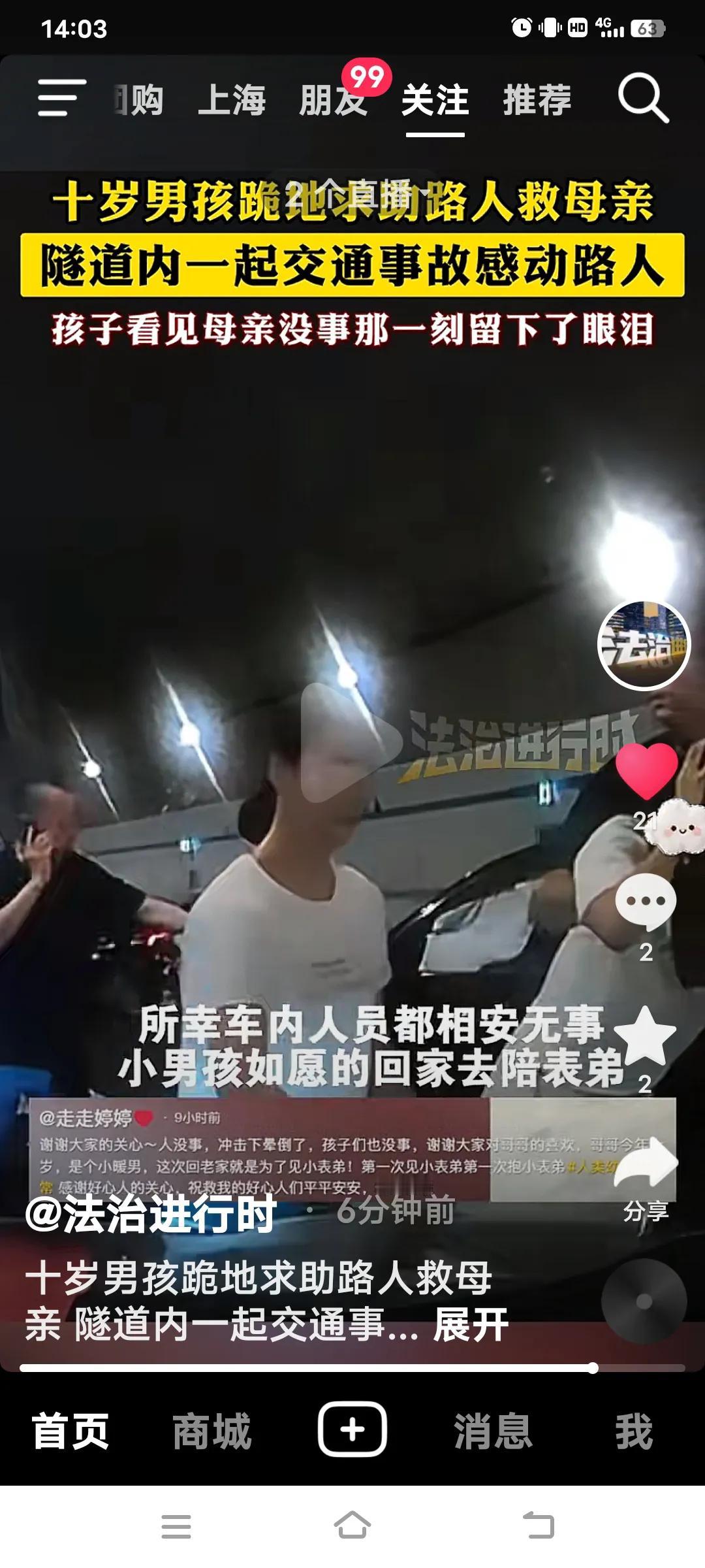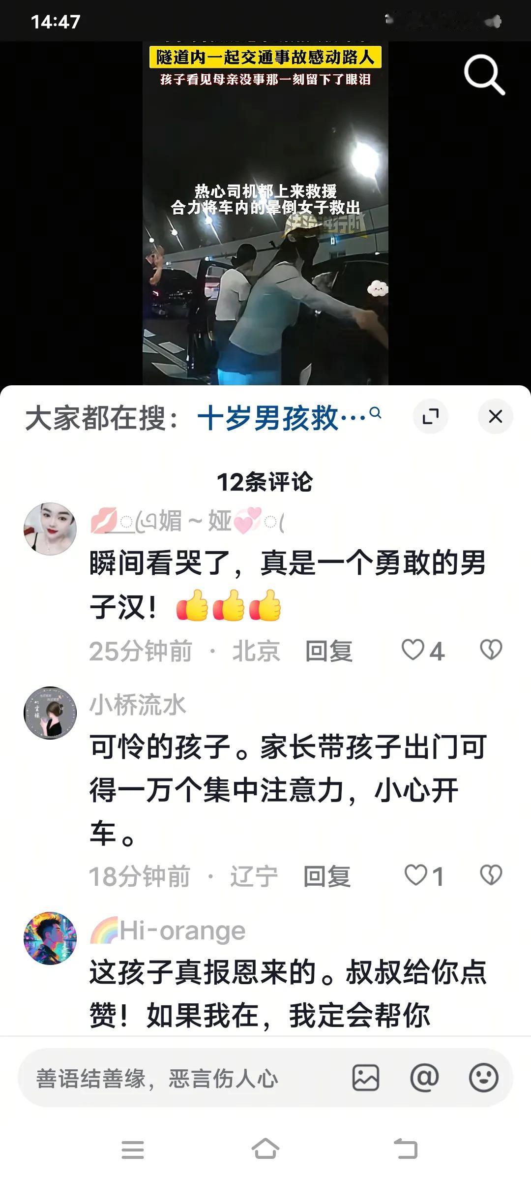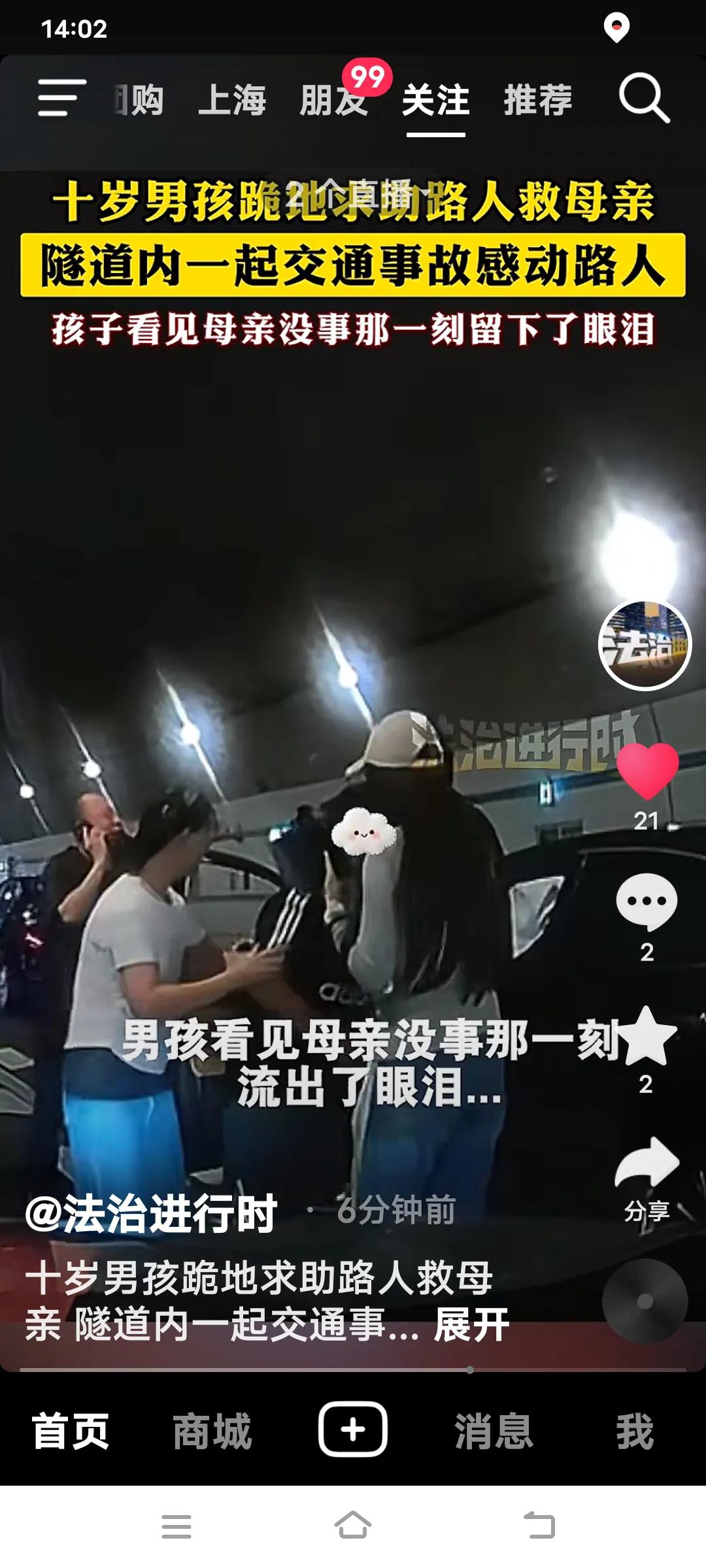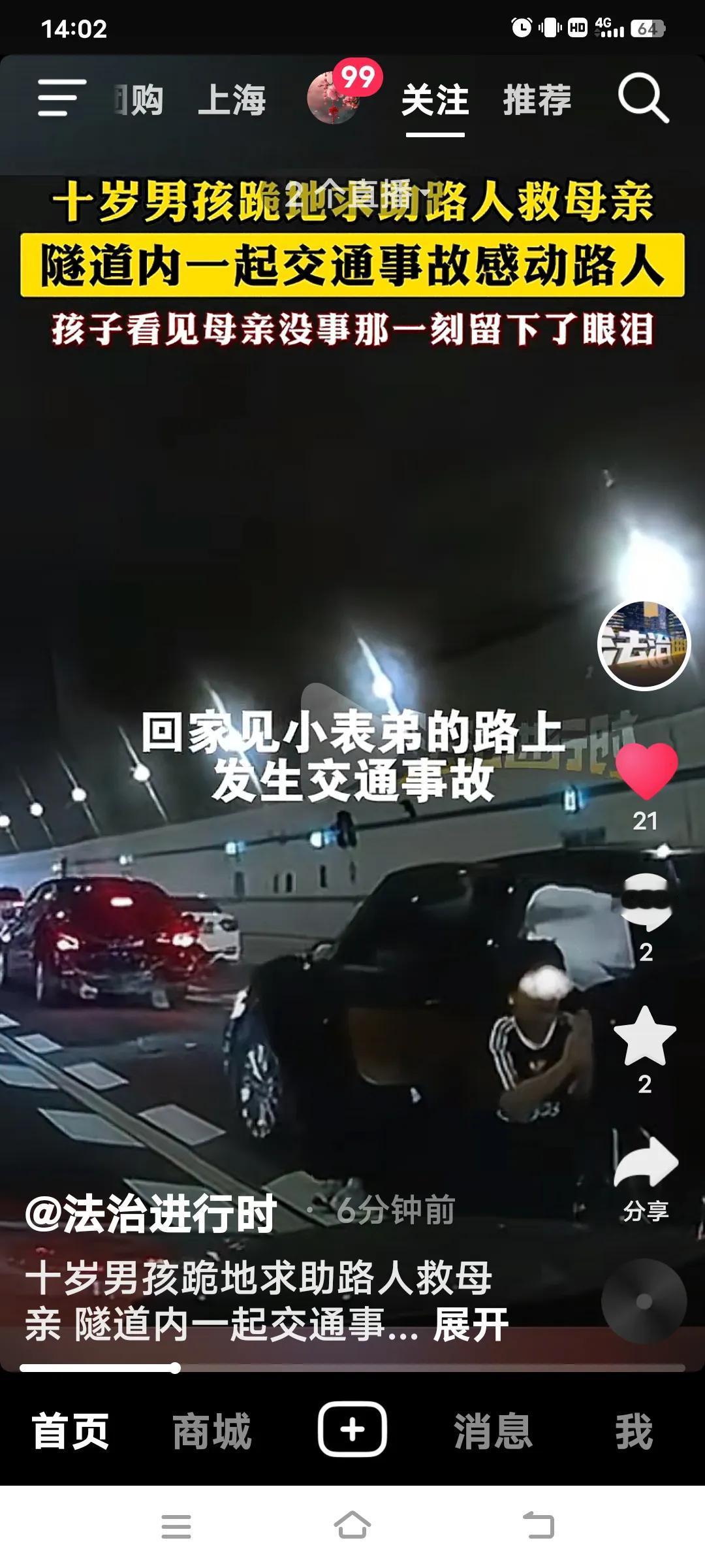 2025年10月4日,杭州日报发布的一段视频令人动容。在广州的隧道里,一辆轿车追尾后停在了路中央,一个十岁的男孩跪在车旁,双手不停作揖,向过往司机求救被困在车内的母亲。 尽管事故发生后正确的做法是放置警示标志、报警并撤离,但孩子面对这突发状况不知所措,只能跪地求助。 最先停车救援的是一位戴黑口罩的年轻女司机,随后其他司机也纷纷加入。大家先报了警,征得同意后才挪动受伤的母亲,生怕随意挪动会造成二次伤害。 看到母亲没事的那一刻,男孩感动的哭了。有的网友说,真是个勇敢的孩子为你点赞👍。瞬间看哭了,等各种看法。确实是呀,带孩子出门在外就是求的平安,小心开车。为此感谢这么多好心人的帮助。广东事故现场 广州交通事故 广东交通事故 广东车祸 车辆碰撞行人