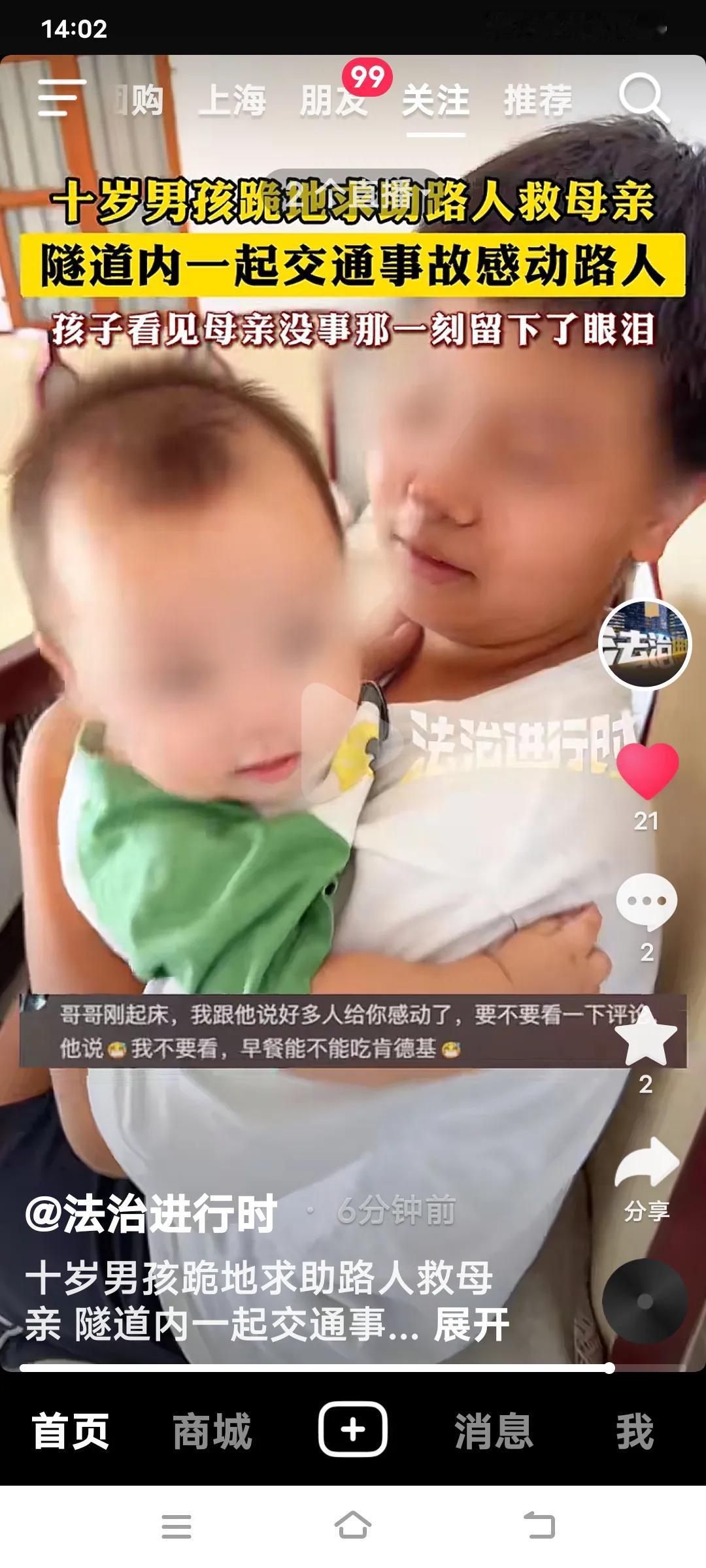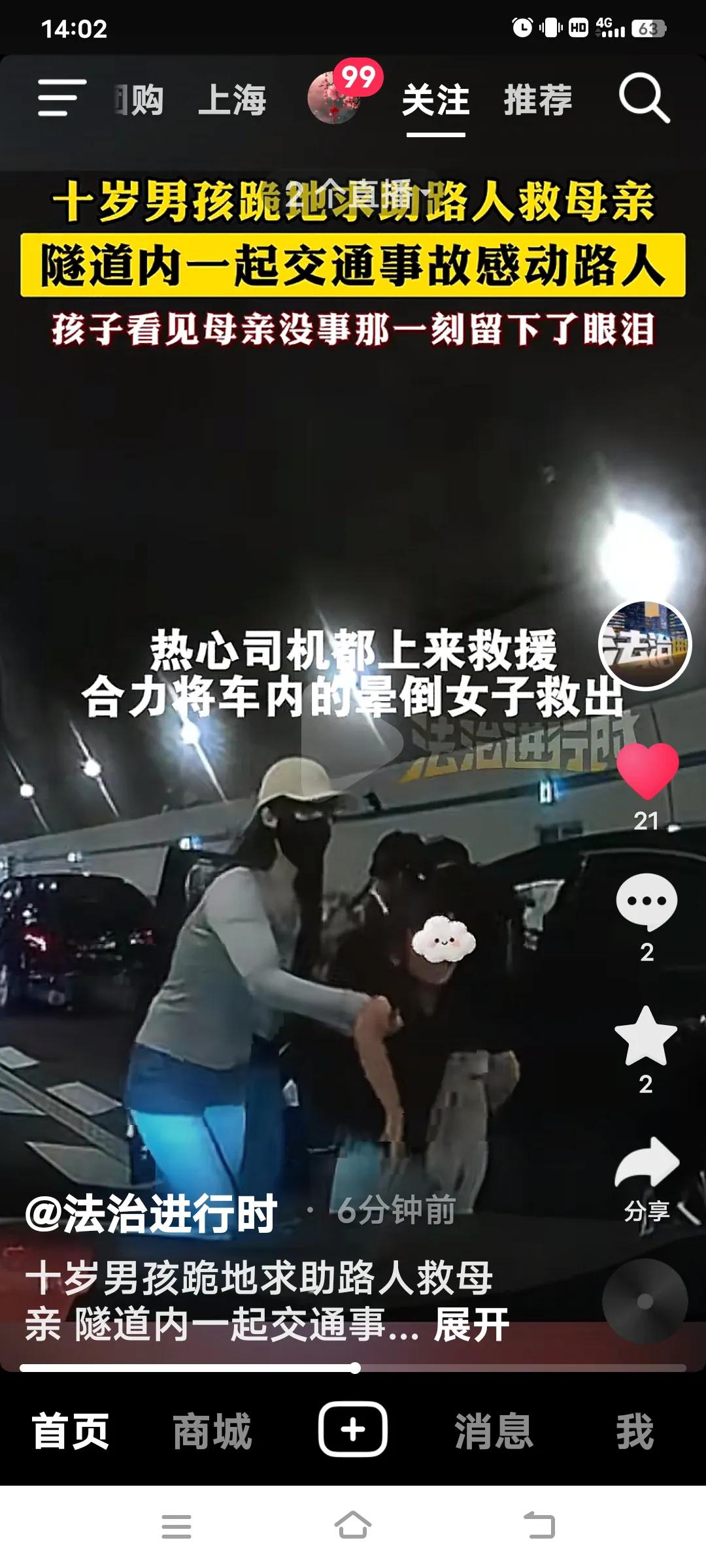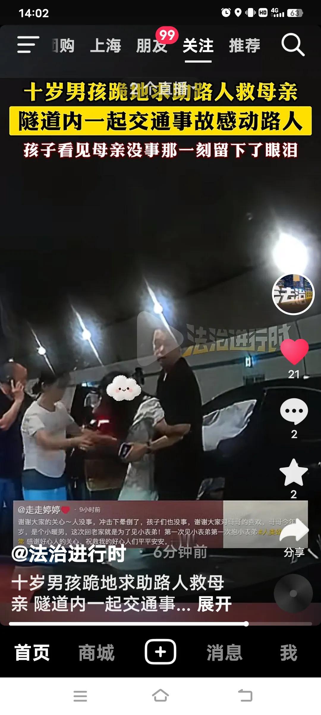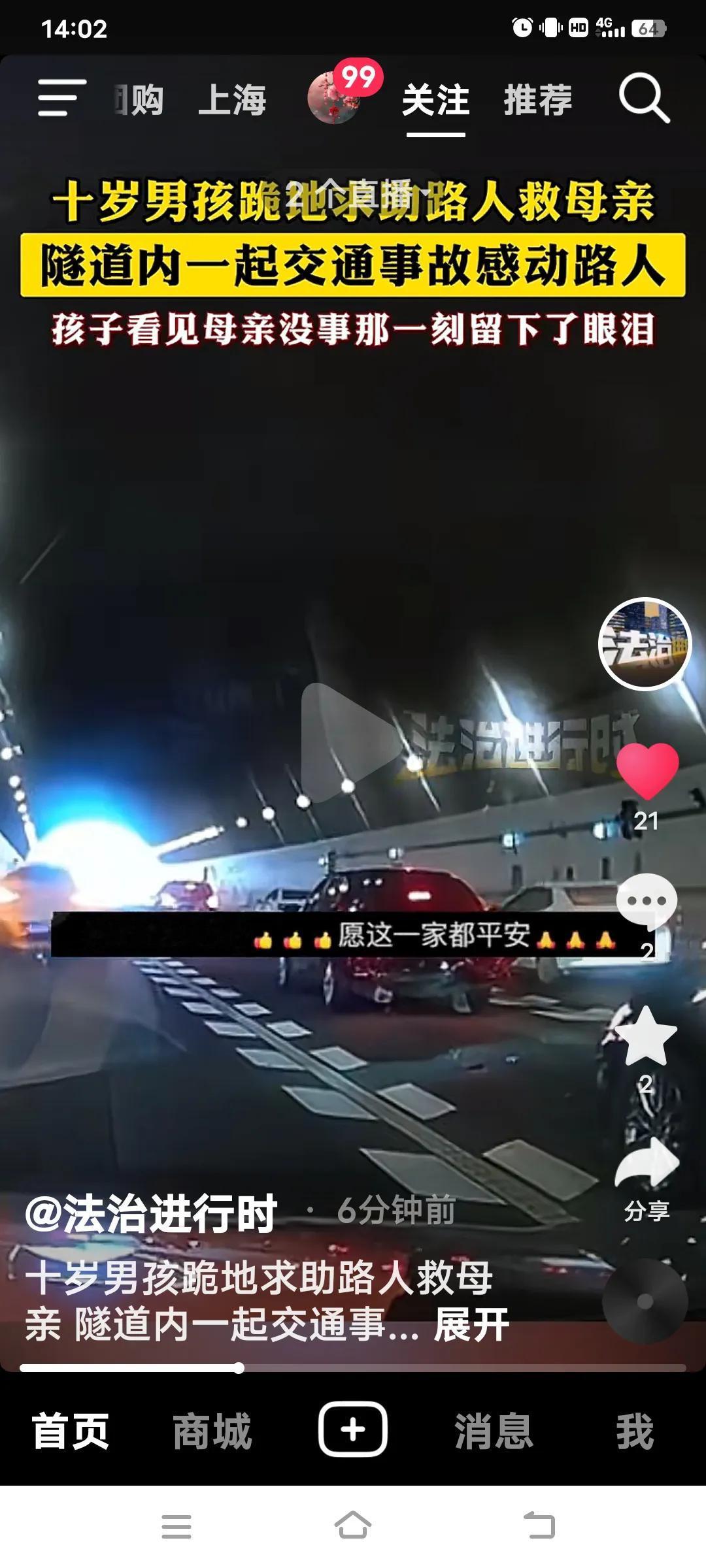 2025年10月4日,杭州日报发布的一段视频令人动容。在广州的隧道里,一辆轿车追尾后停在了路中央,一个十岁的男孩跪在车旁,双手不停作揖,向过往司机求救被困在车内的母亲。 尽管事故发生后正确的做法是放置警示标志、报警并撤离,但孩子面对这突发状况不知所措,只能跪地求助。 最先停车救援的是一位戴黑口罩的年轻女司机,随后其他司机也纷纷加入。大家先报了警,征得同意后才挪动受伤的母亲,生怕随意挪动会造成二次伤害。 看到母亲没事的那一刻,男孩感动的哭了。有的网友说,真是个勇敢的孩子为你点赞👍。瞬间看哭了,等各种看法。确实是呀,带孩子出门在外就是求的平安,小心开车。为此感谢这么多好心人的帮助。广东事故现场 广州交通事故 广东交通事故 广东车祸 车辆碰撞行人
